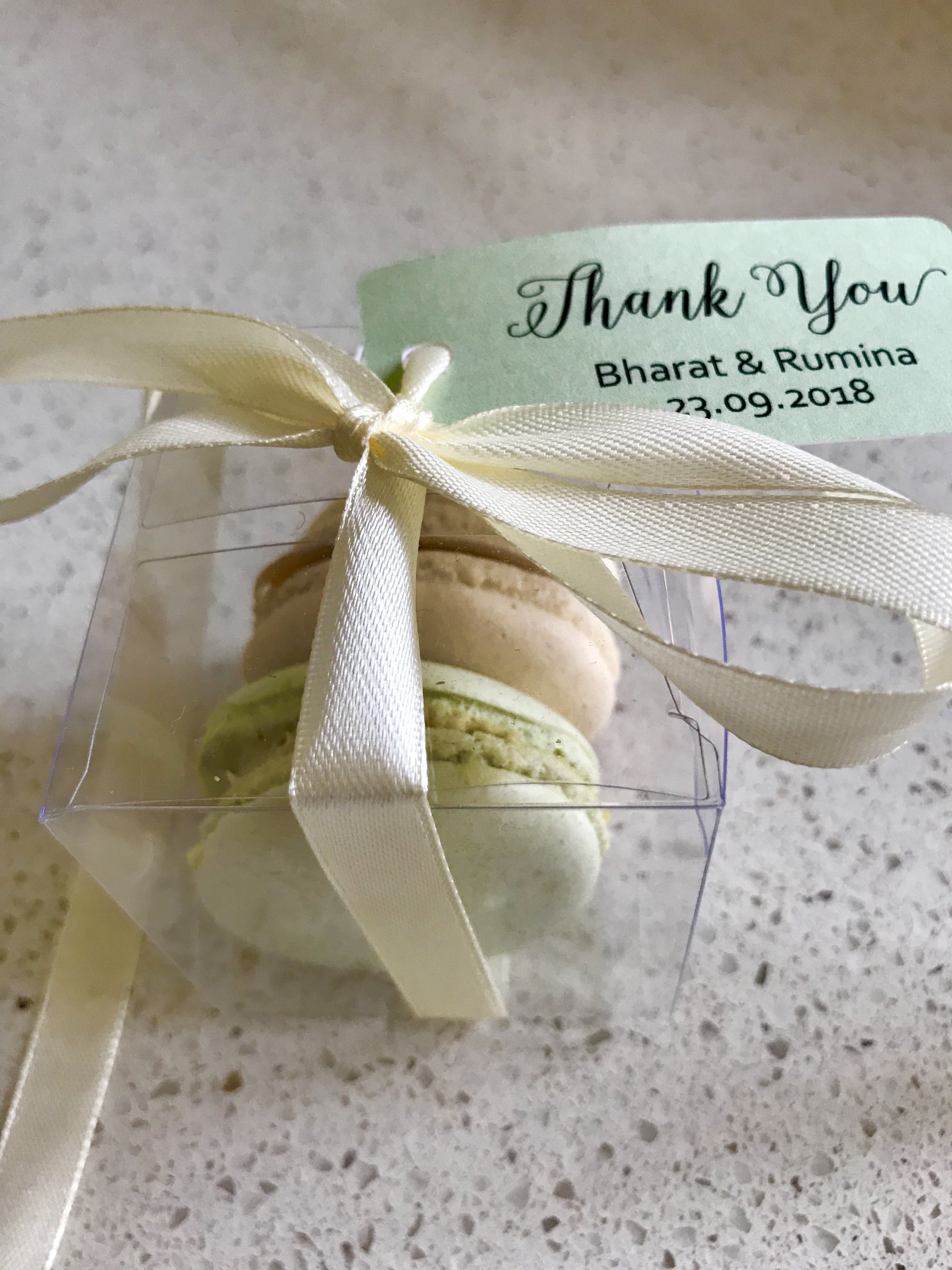 "Thank you so much for creating my wedding macarons. They matched my wedding colours and added that extra to the table setting! A perfect final touch!" — Sarah.