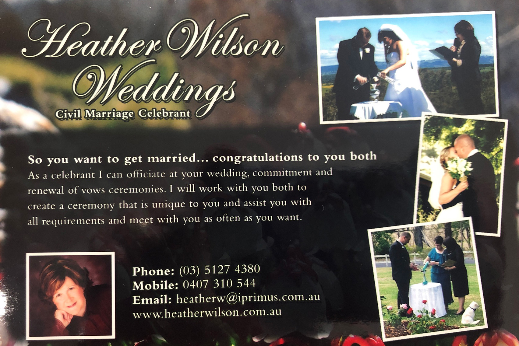 When you meet with Heather, you'll quickly warm to her friendly, carefree, and happy personality. She has a caring and fun-loving nature that will make you feel comfortable and at ease, as you plan your ceremony together. Heather's motto is "It's your wedding, it's your choice, it's your ceremony, it's unique to you," which means she is committed to helping you create a ceremony that truly reflects who you are as a couple.