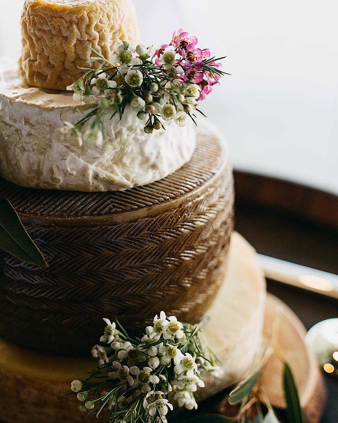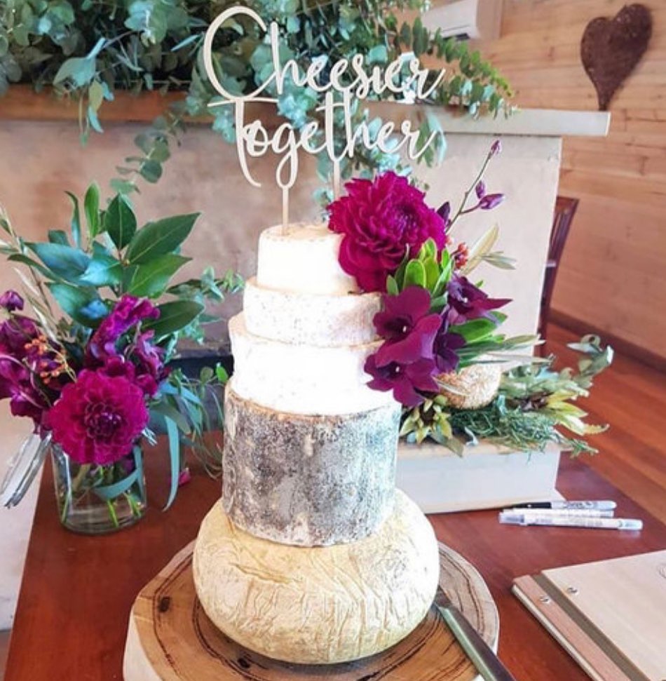 Could we suggest a cheese wheel wedding tower? The savoury flavours work so well as a post dessert snack for your guests or even as dessert and the party kicks into high gear. It cuts like a traditional cake and then the kitchen can break it down for your guests to enjoy from platters and boards.