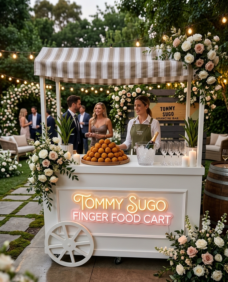 The Tommy Sugo wedding cart is a fully interactive Italian street food experience where everything is cooked fresh to order and served immediately to your guests, like having your own private restaurant at your event.