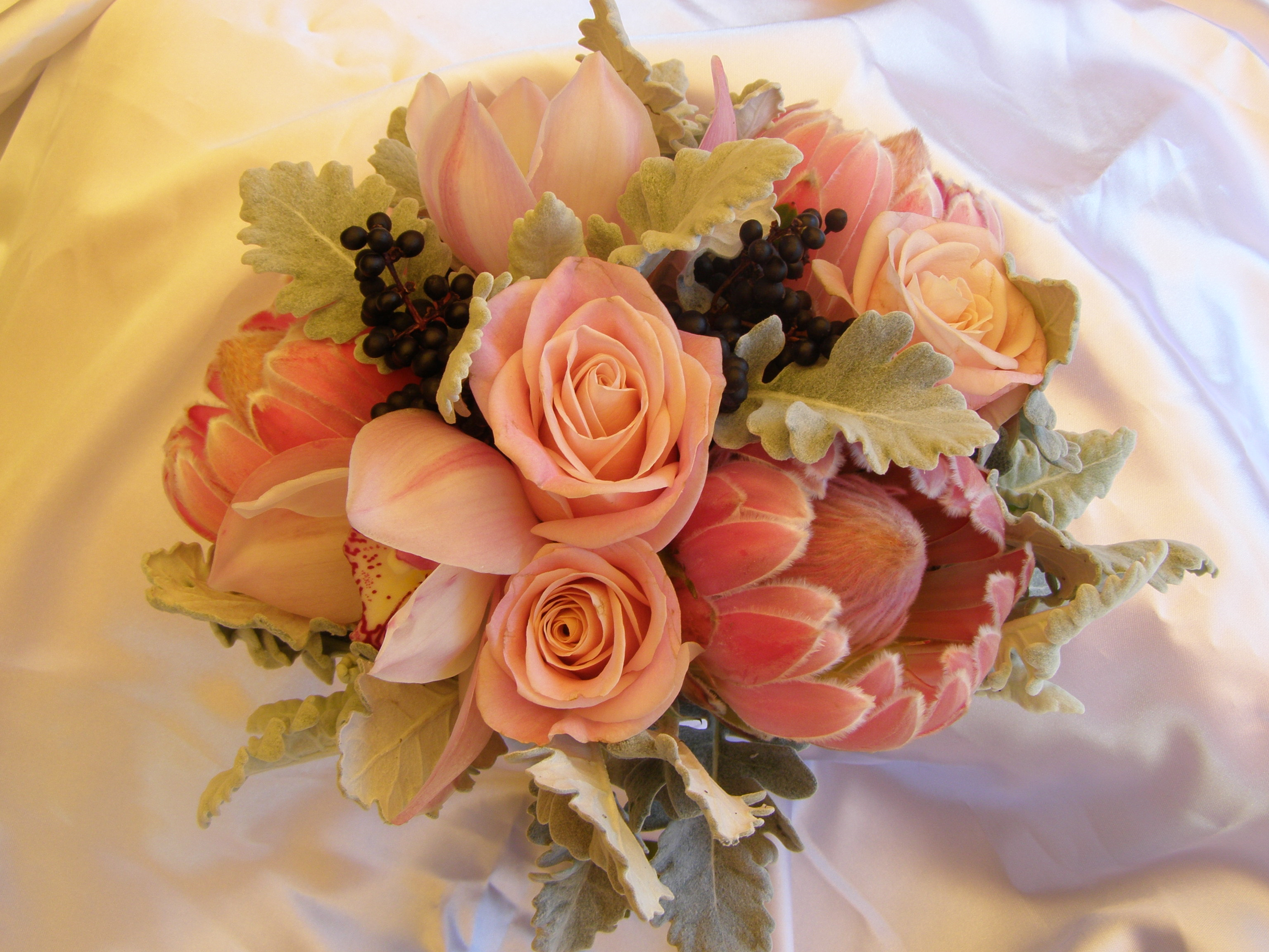 KIng Protea and Gumea Lillies add the wow factor and foliage like Blue Gum, Tea Tree and Tetra Nuts give shape and style.