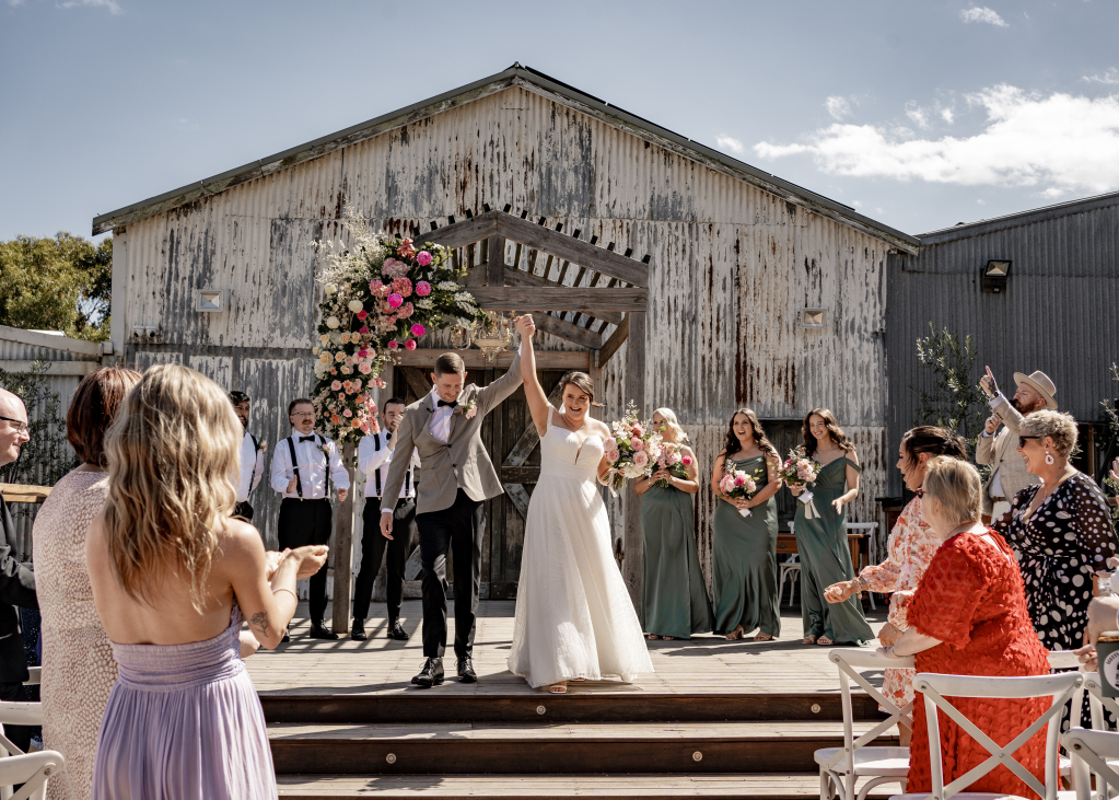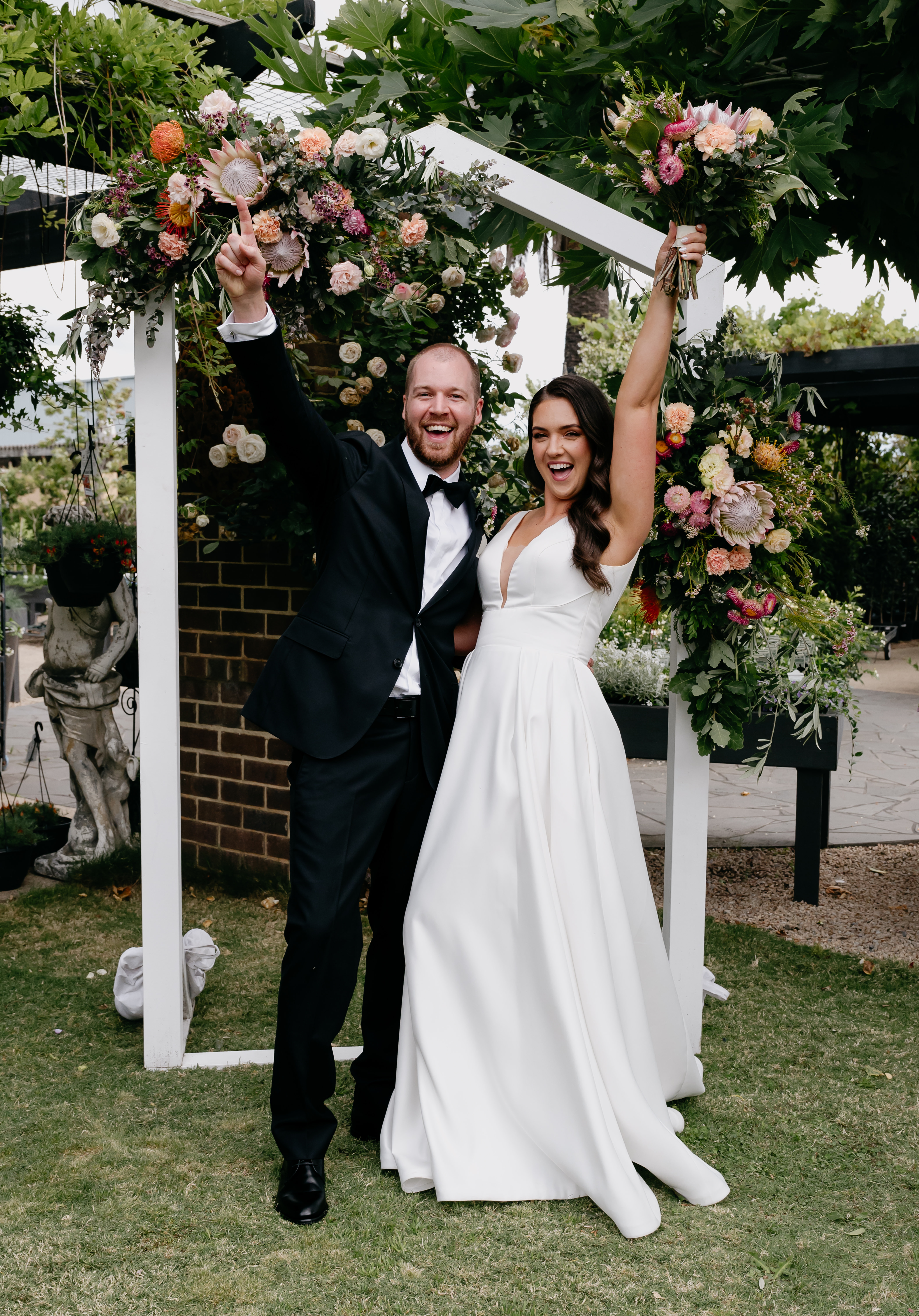 “Tam created our beautiful florals for our wedding in October, and she is phenomenal! From day dot, she was easy to coordinate with and very accommodating. We told her what we needed, sent a handful of inspiration images, and she worked the rest. When Tam dropped off our bouquets in the morning, I couldn’t believe how beautifully she had created them. I had mentioned I loved King Proteas but knowing they were seasonal and hard to get, I didn’t expect them. When I saw them, I almost burst into tears! All day everybody was commenting on how stunning the flowers were. The gazebo, bridal table arrangement, buttonholes, corsages, chair posies and backdrop florals were all also absolutely incredible. The arrangements will forever be my absolute favourite. We feel so very lucky to have had Florium Creations be a part of our wedding day!” — Hayley C.
