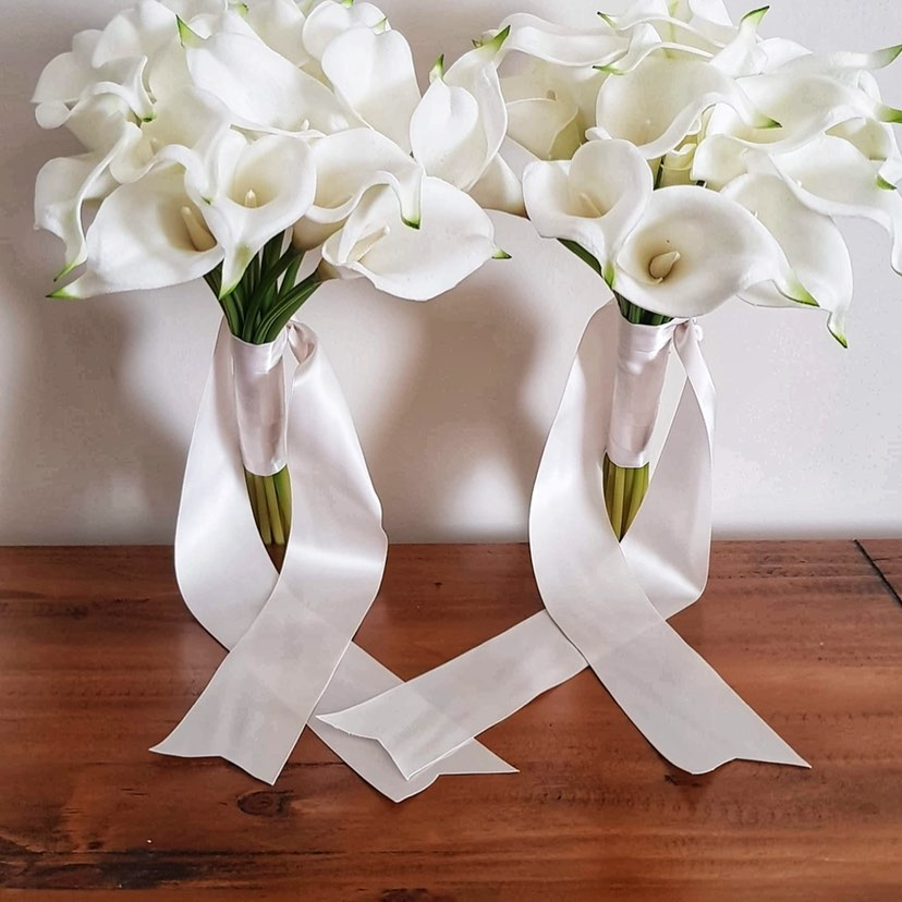 A range of quality silk flowers. Petals n Pods select only the finest artificial flowers for their bouquet, including red, white, and pink silk roses, purple and ivory Calla Lilys, and pale blush peonies.