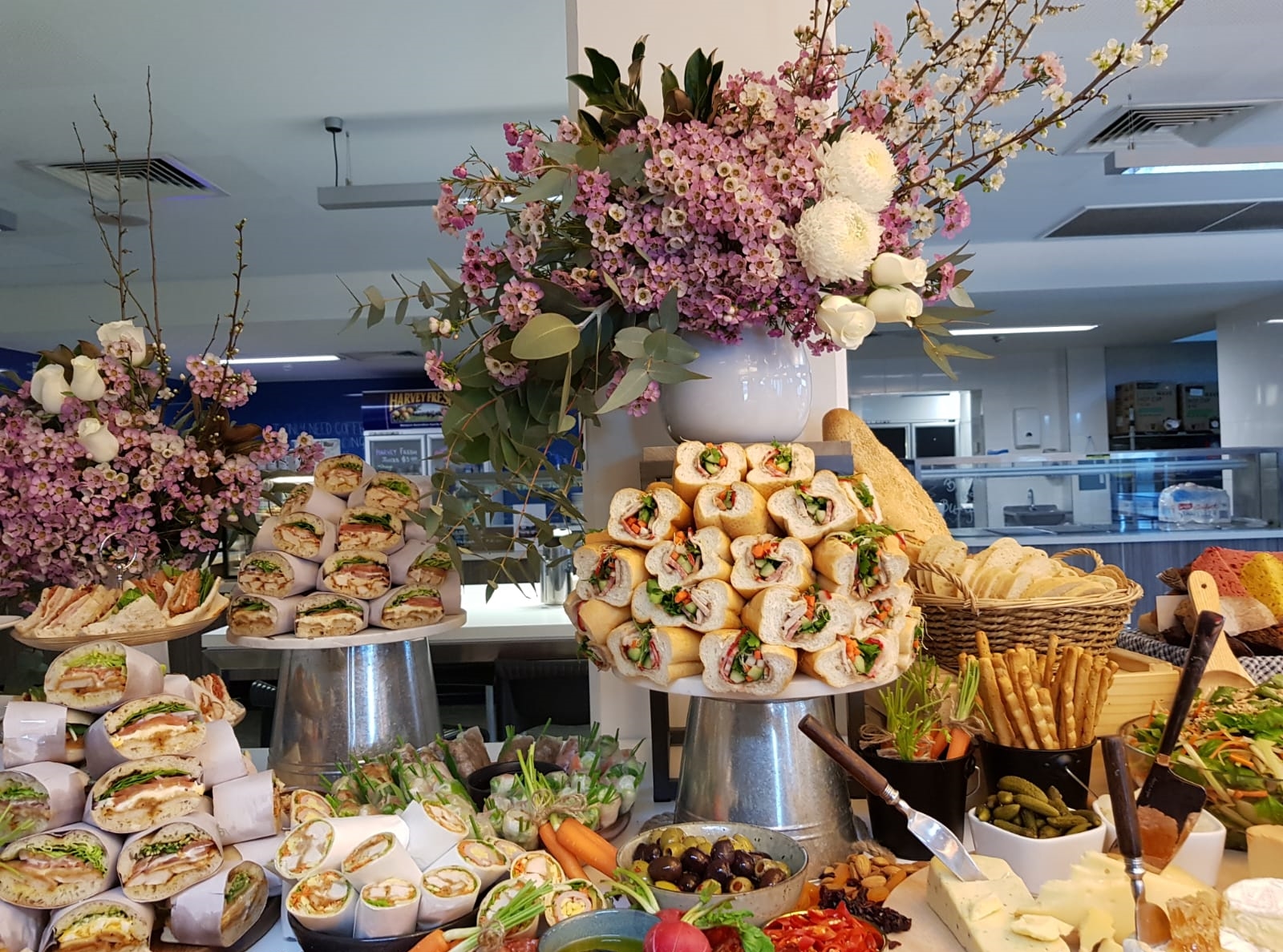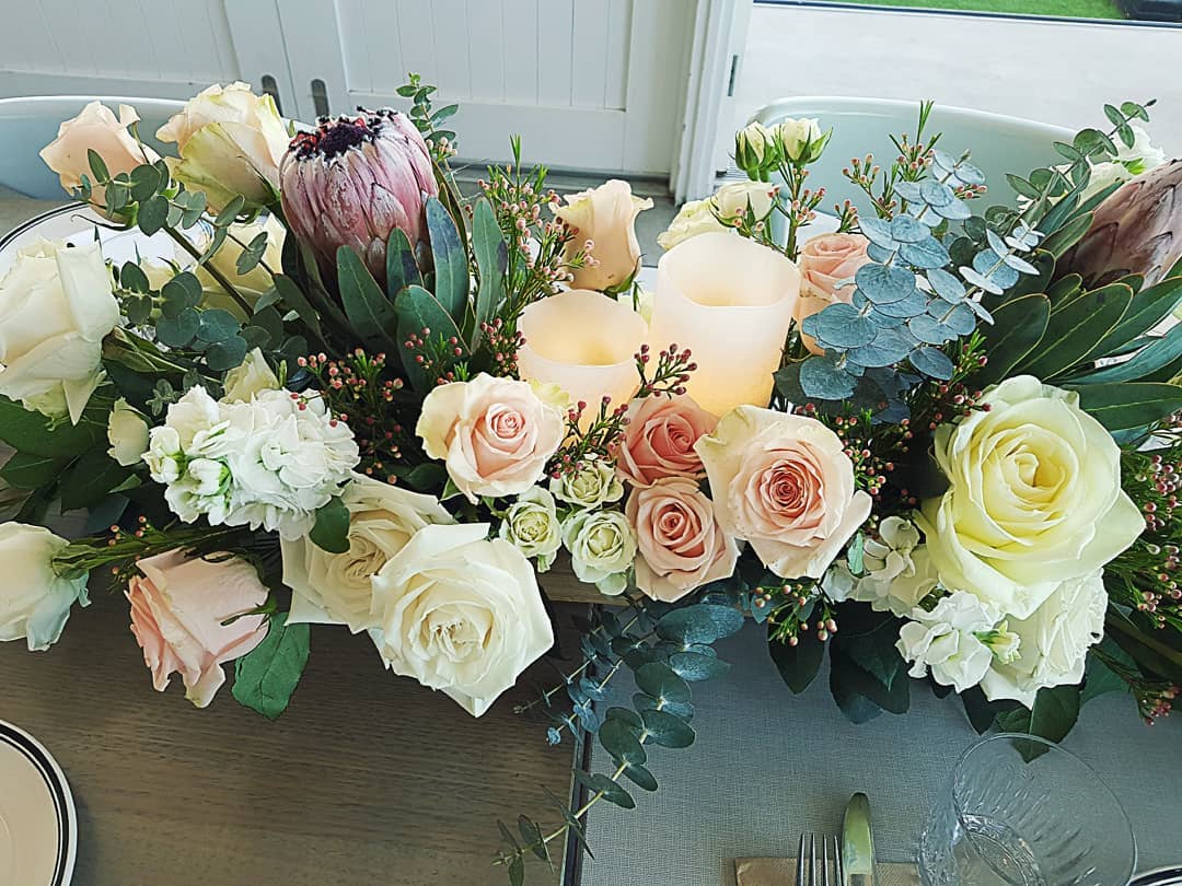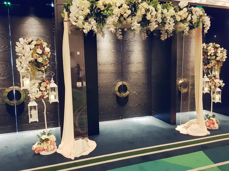 * 250 guests -DECORATE- * Brides bouquet * The Reception hall consisting of - 25 csndellabra - main bridal table of 10-12 metres - Cake stand * 5 bridesmaids bouquets * 2 flower girls * 21 buttonholes * 4 church arrangements * 40 church pews * staircase at home
