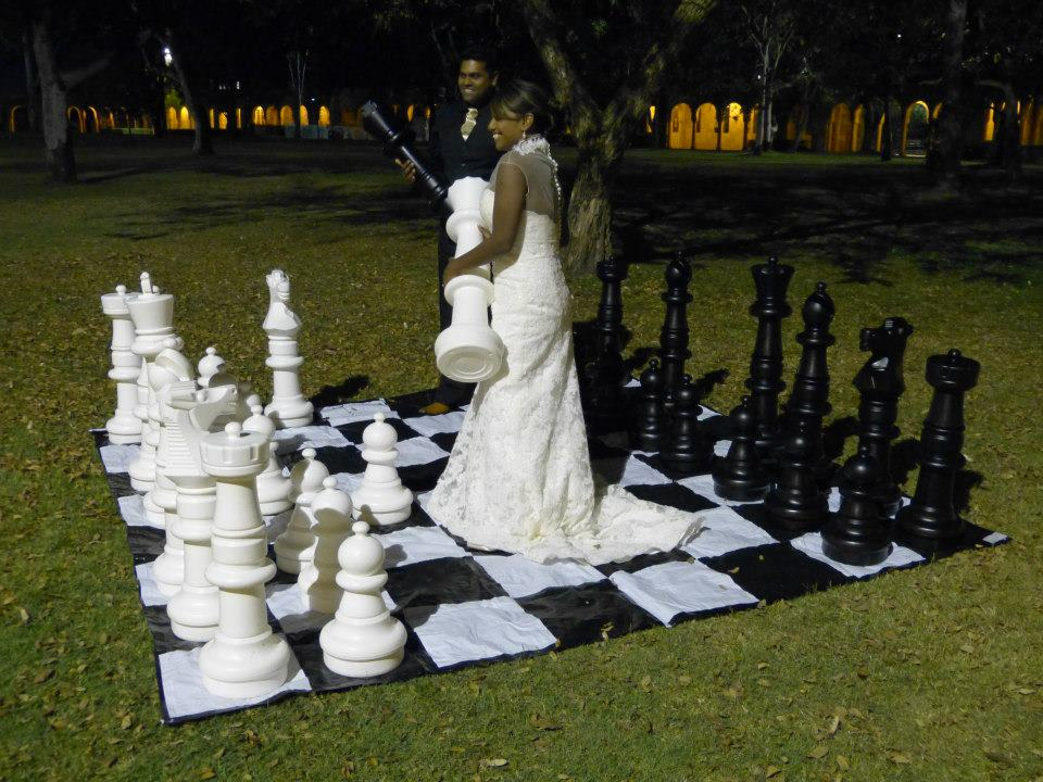 Our Giant Games are often used at weddings (particularly outdoor weddings) as low impact entertainment for your guests for that period of time between the wedding ceremony and the reception, while you are off signing documents and having your wedding photos taken. The inclusive nature of our Giant Games are a great ice-breaker and encourage socialising amongst your guests, while you are away. Some of our Giant Games (for example, Giant Chess) are also useful as part of the photo shoot.