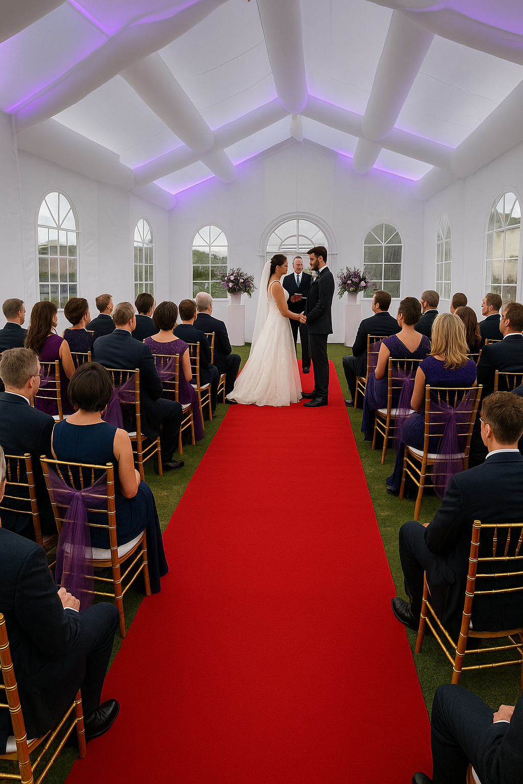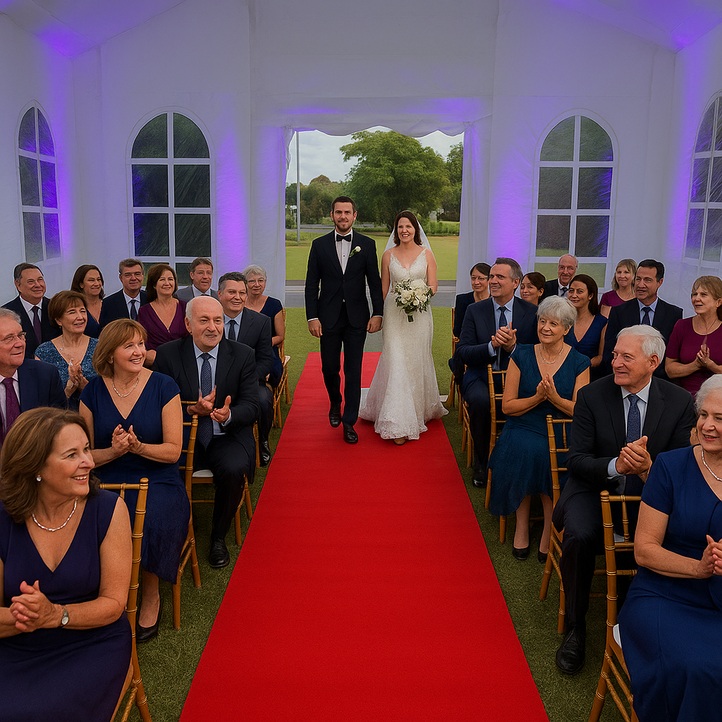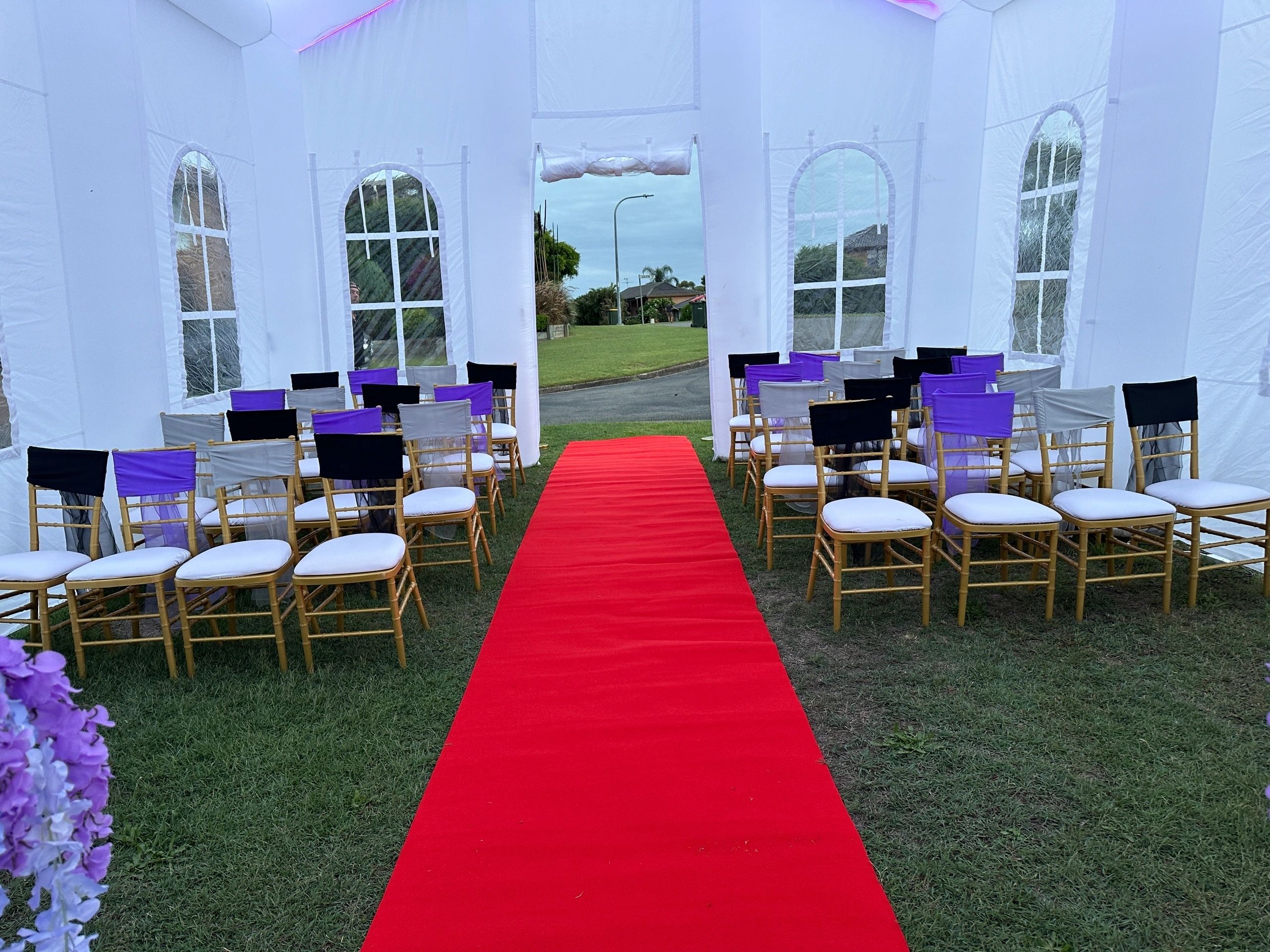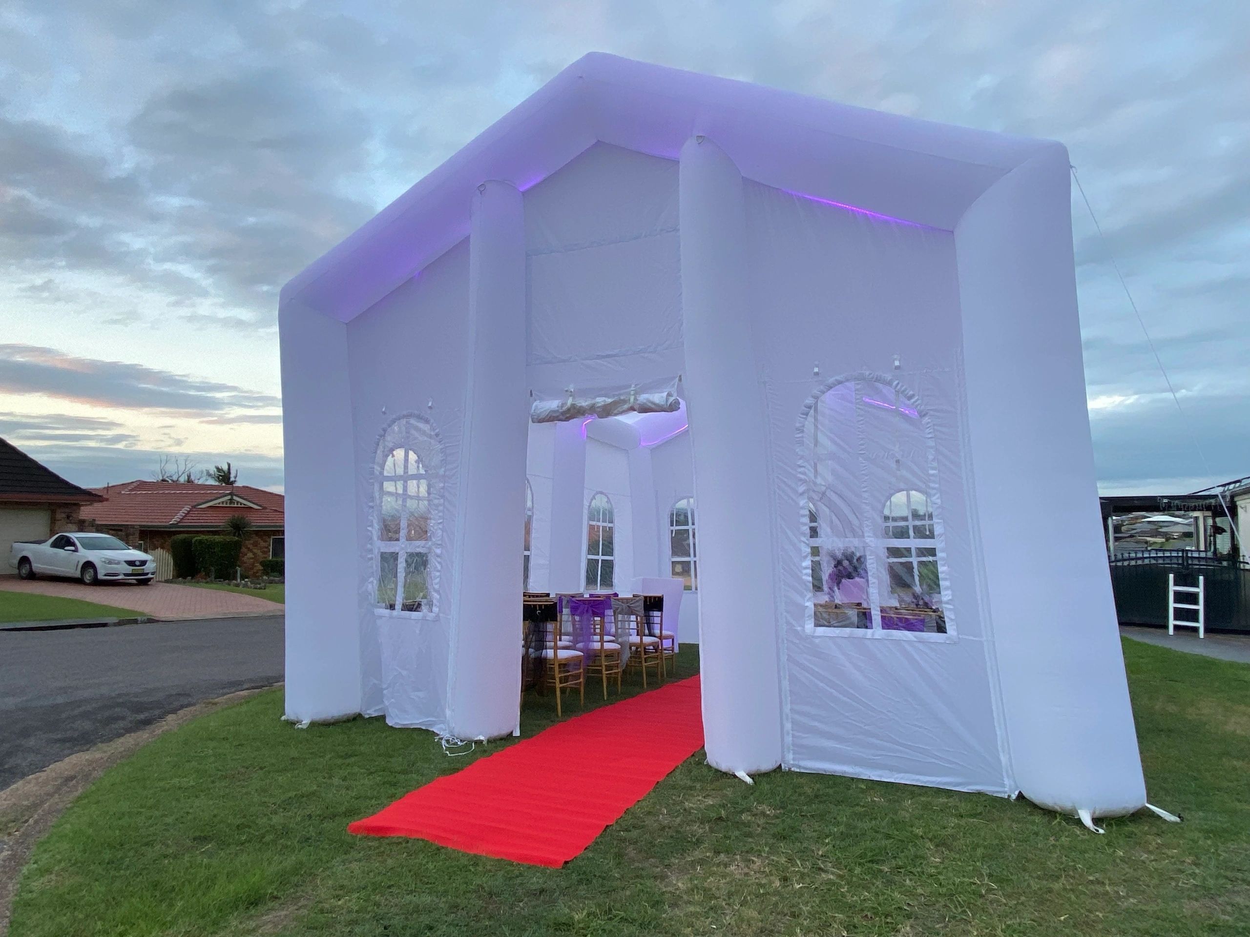 Pumpin’ Glow Mobile Party Hire offers a fully equipped wedding package designed to take the stress out of planning. The inflatable chapel has elegant gold Tiffany chairs, a luxurious red carpet entrance, and stylish floral arrangements. Couples can customise the chapel’s lighting to match their colour scheme, creating a breathtaking backdrop for vows.