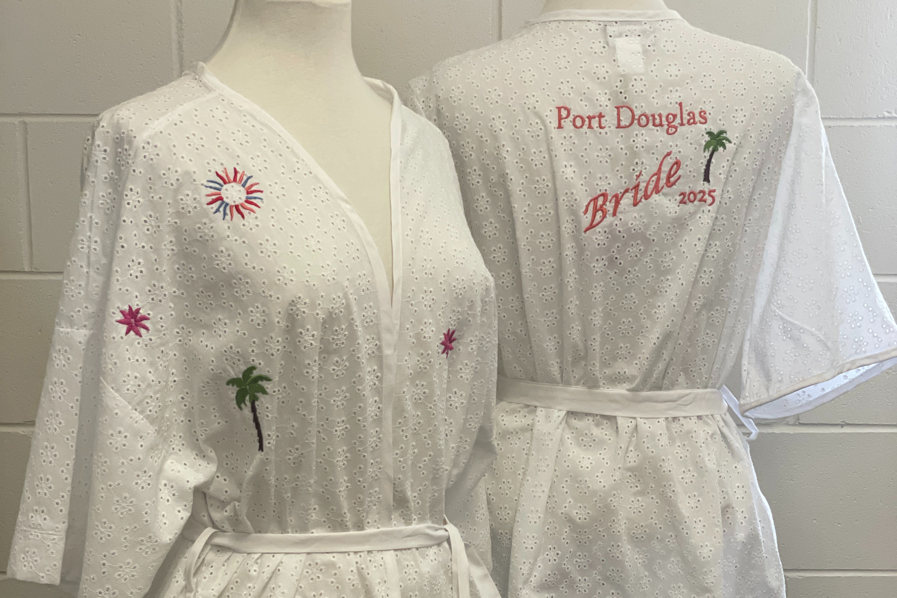 The robe in the foreground features embroidered text in blue that reads "Port Douglas Bride 2025", accompanied by a small embroidered palm tree, adding a personalized and destination-themed touch. It has a sash tie around the waist, enhancing its elegant and relaxed fit.
