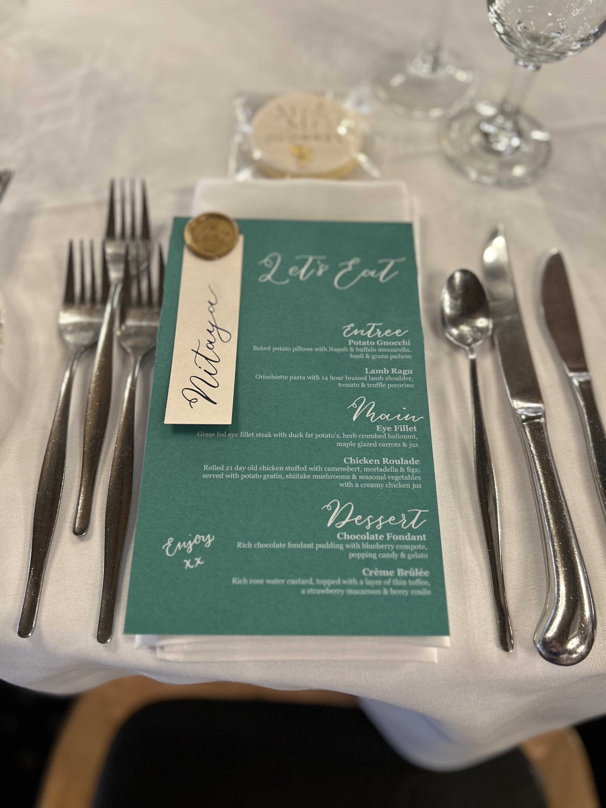 * offer is inclusive of the following options: place card atatched with standard wax seal, paper clip, free standing place card, written directly onto menu