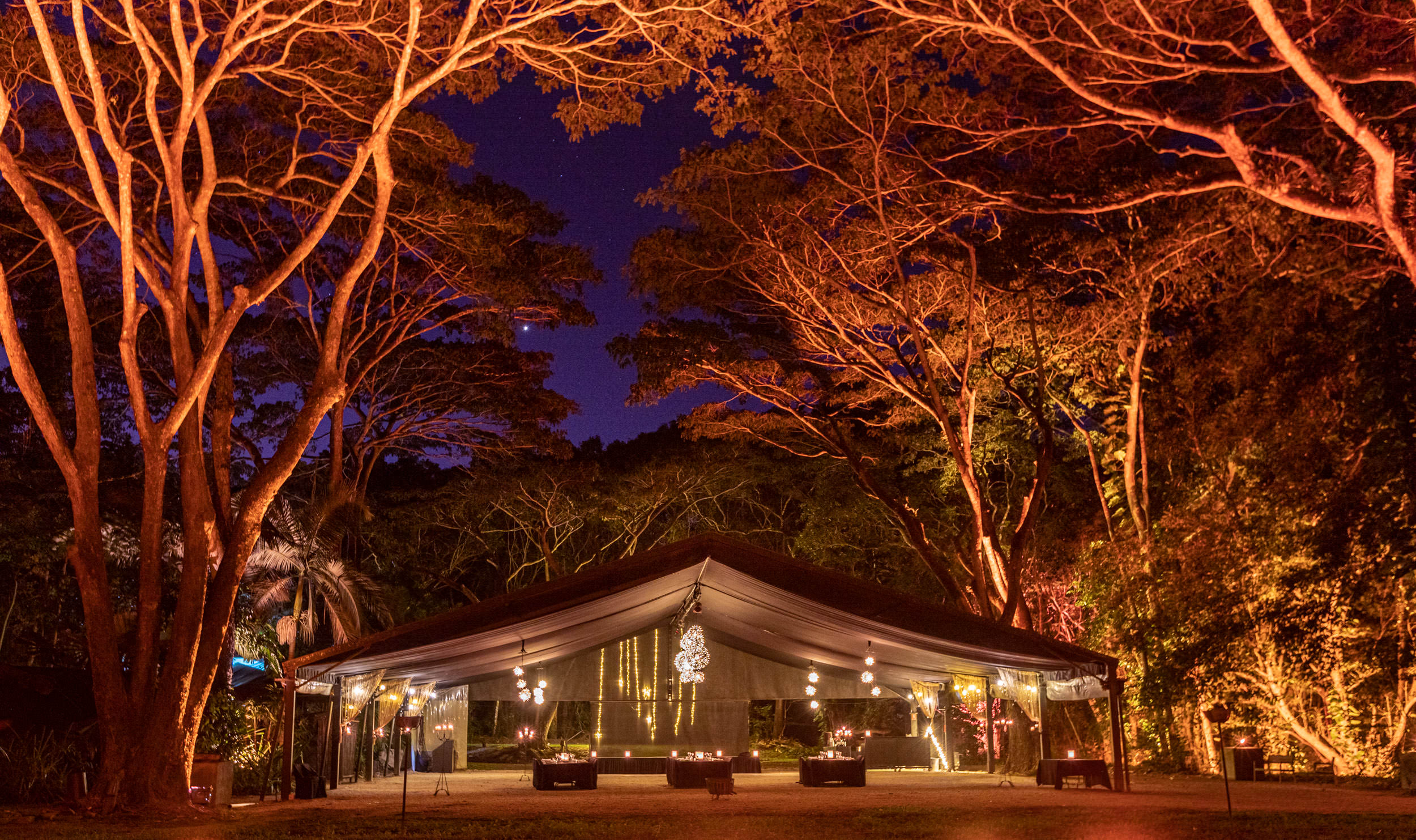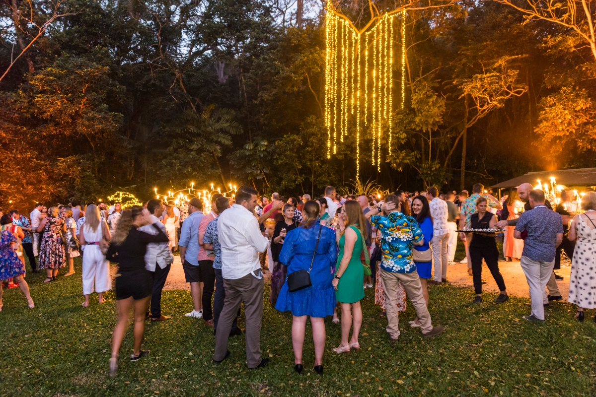 As night falls, Flames of the Forest transforms into a candlelit wonderland. Under the ancient rainforest canopy, guests dine on tropical-inspired dishes at styled tables, paired with premium beverages and impeccable service. With exclusive venue access and no noise restrictions, you’re free to celebrate long into the evening in a setting that feels truly otherworldly.