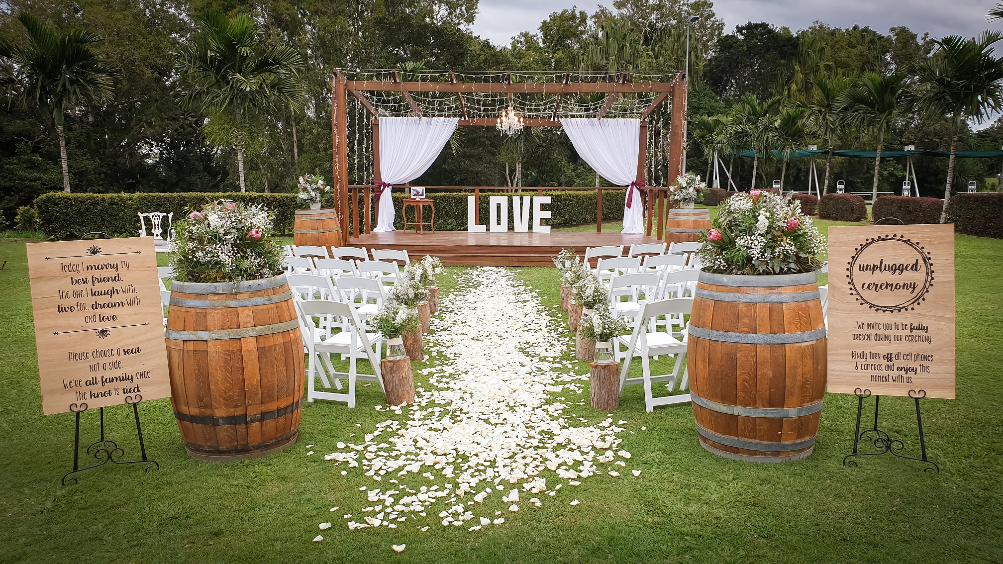 The Rosewood Room is our largest indoor function space which provides a completely private space for your wedding for up to 220 seated guests. The Deck & Gardens is our newest function space which has been a hit with newly engaged couples. This space is the most versatile as it can cater for everything from ceremonies to receptions and with the hire of an outdoor marquee we can host up to 400 guests comfortably. Our Marquee is a function space ideal for the small intimate gatherings, whilst providing a casual laid back atmosphere which would be perfect for those cocktail style weddings. The Marquee when teamed up with The Deck can host up to 150 guests throughout the entire space. The Courtyard has the convenience of being outside but undercover with a casual relaxed atmosphere, near the kids playground. It can seat up to 120 seated or 200 cocktail.