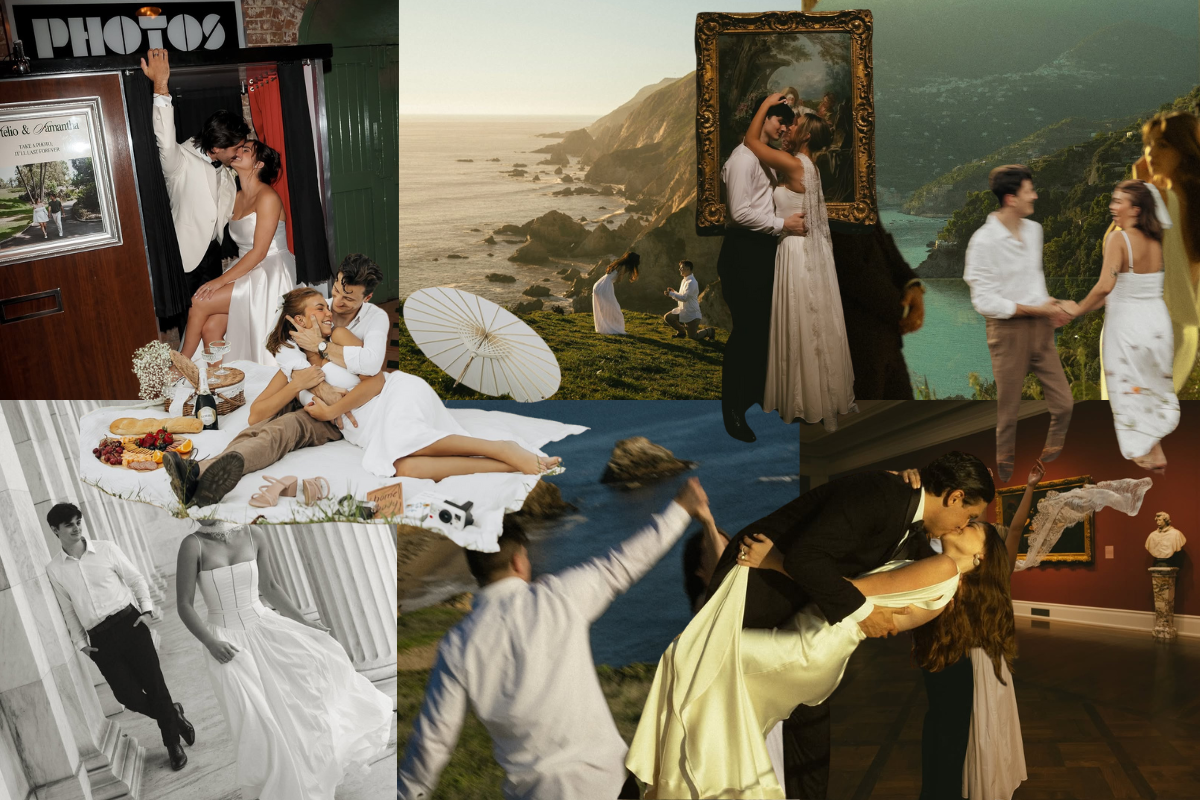 Sweet, silly, and slightly nostalgic, an old school photo booth shoot brings charm in spades. Whether it’s a real booth at your local arcade or a professional setup styled to feel like one, this approach offers a fresh alternative to the posed-and-perfect. The appeal is in the spontaneity: mismatched expressions, mid-blink laughs, lipstick smudges, hair a little out of place. It’s giving real life but make it romanticised.