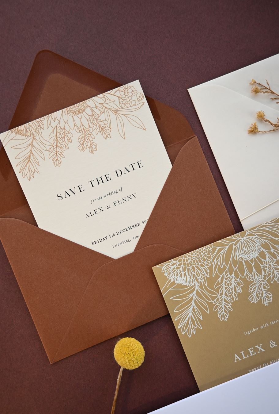 Clean typography is a favourite for couples who want a refined look. Think wide spacing, soft serif fonts or a single hero typeface that carries the entire suite. When the lettering is this simple, every detail matters, so designers use careful alignment, gentle colour variations and high-quality printing to elevate the look. It is understated but incredibly chic.