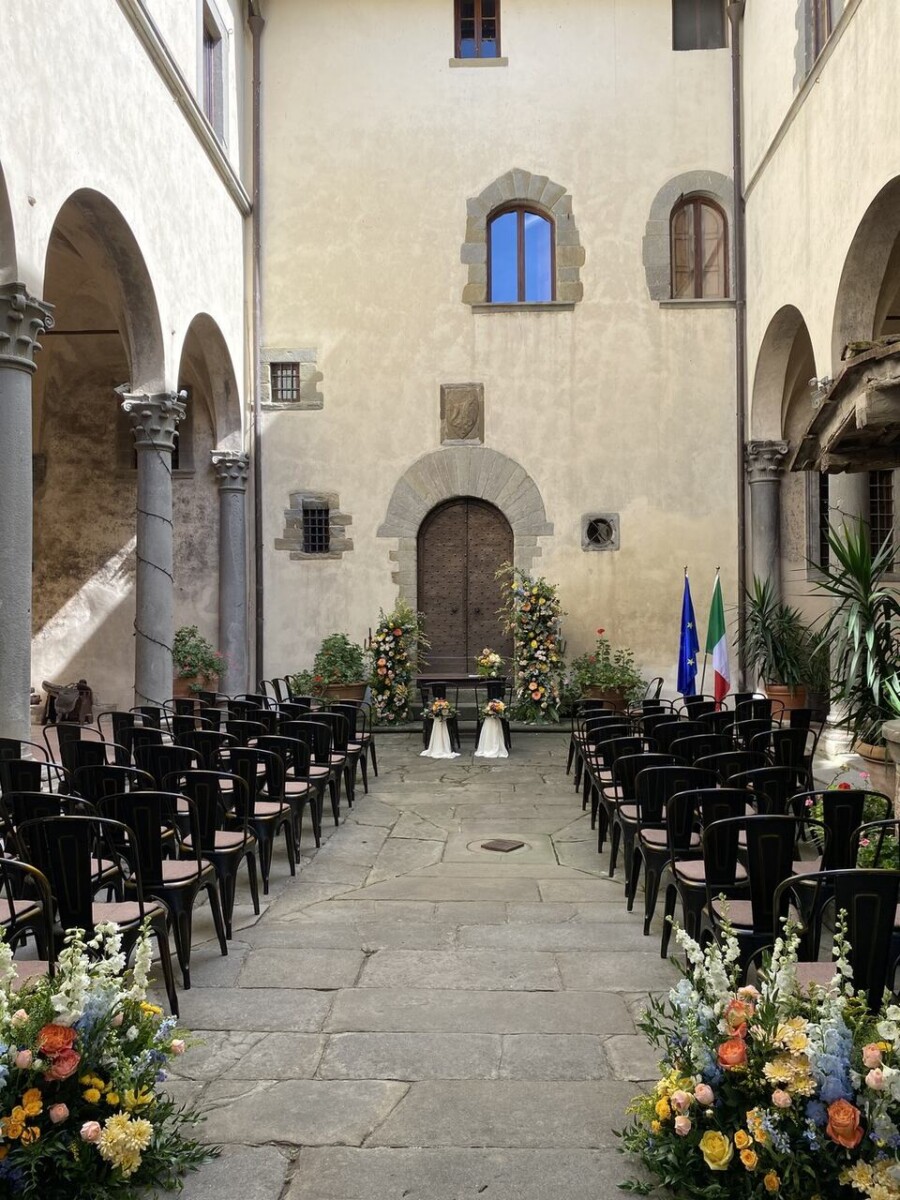 Celebrate your wedding day within the historic stone walls of Castello del Trebbio, surrounded by Tuscany’s vineyards and olive groves. Exchange vows in the castle’s charming courtyard, where the golden light can shine on timeless architecture, creating a genuinely romantic, old-world atmosphere. For a more intimate or private gathering, the gardens offer tranquil spots surrounded by flora and the historic charm of the castle.