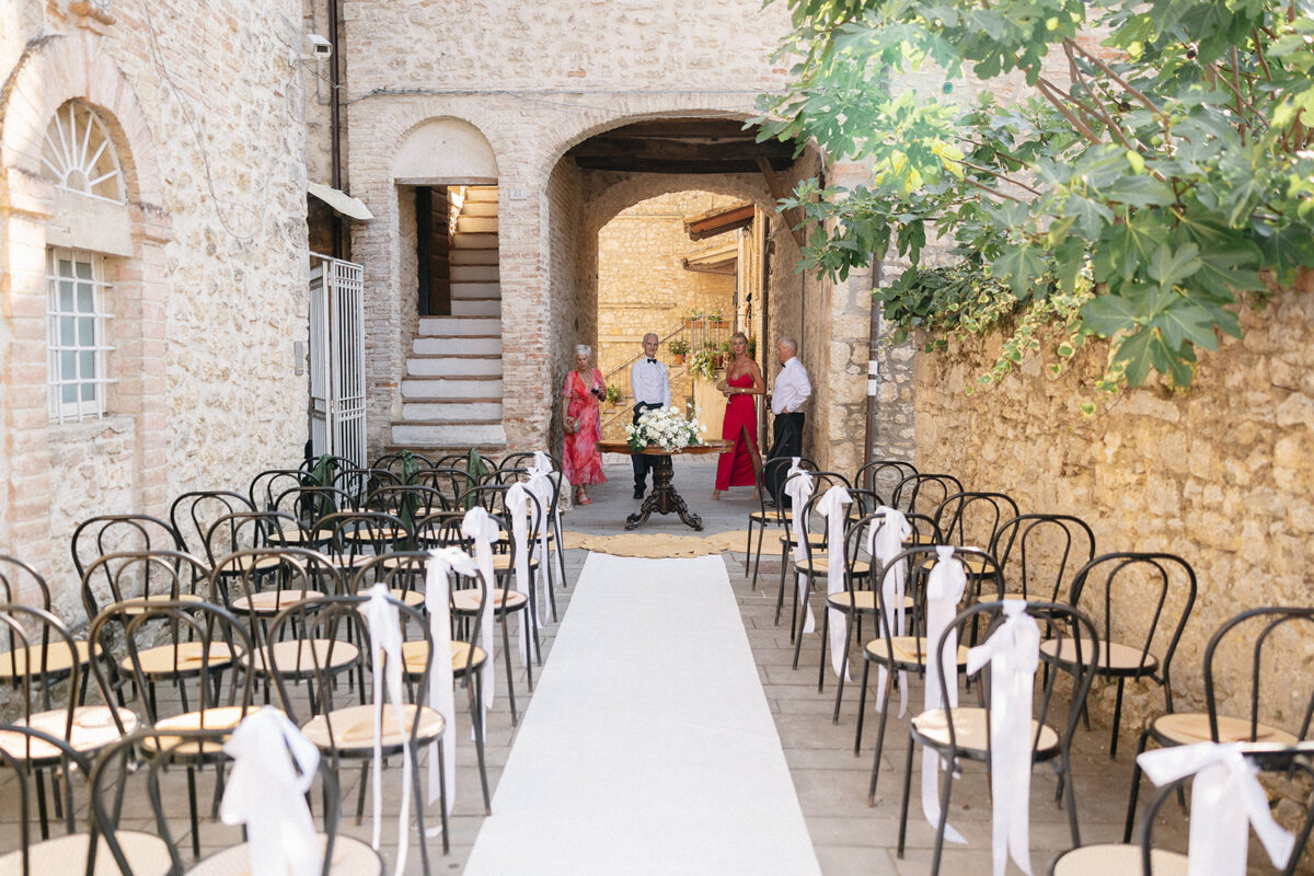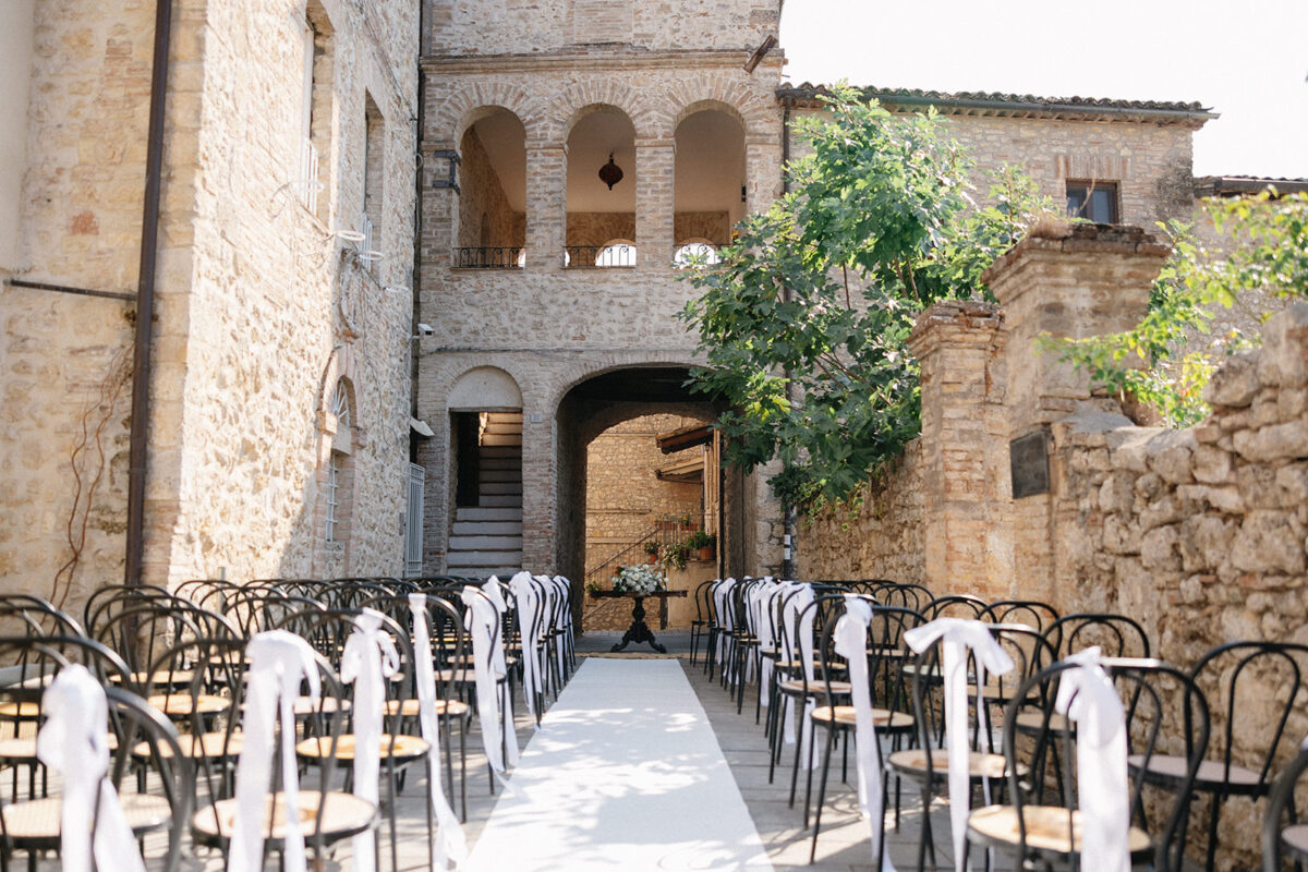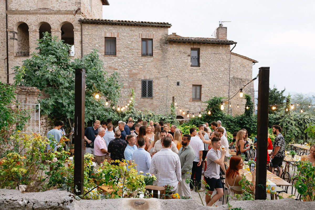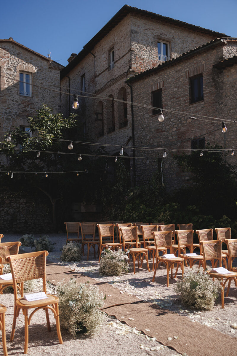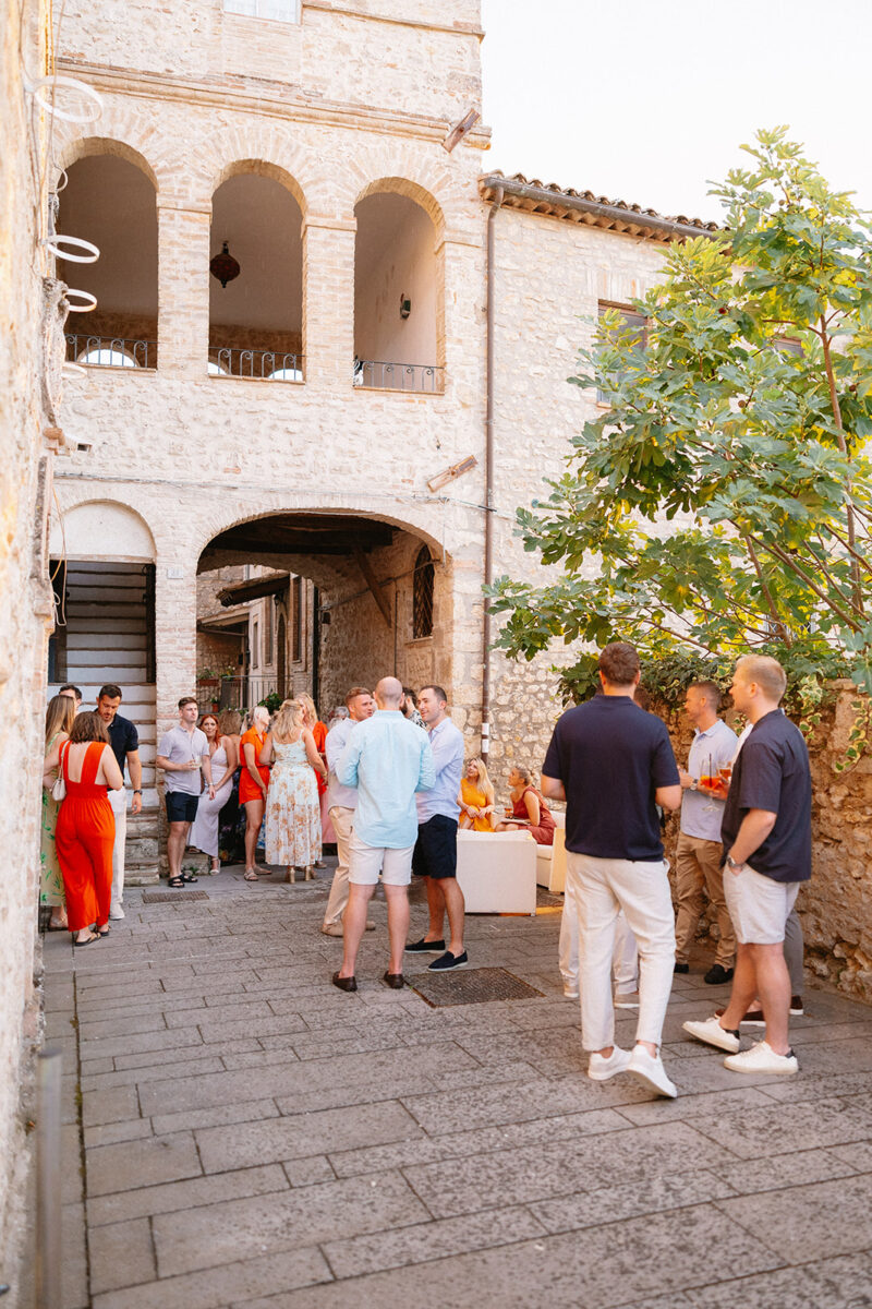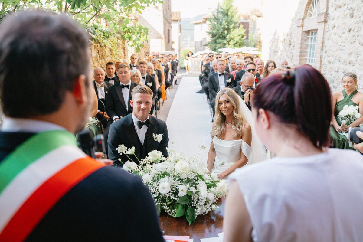 Castello di Montignano brings a sense of depth and atmosphere that’s hard to replicate, with its restored stone walls, quiet courtyards, and far-reaching Umbrian views shaping the experience. The setting feels considered rather than styled, allowing each part of the celebration to unfold naturally within the castle grounds.