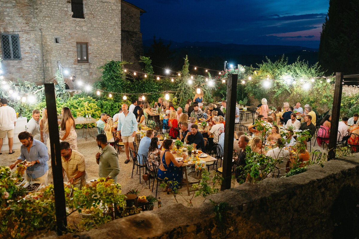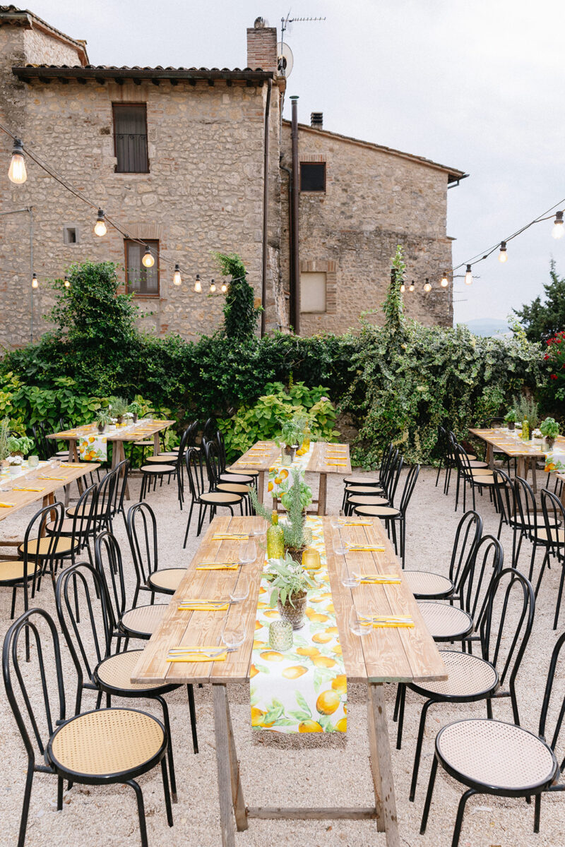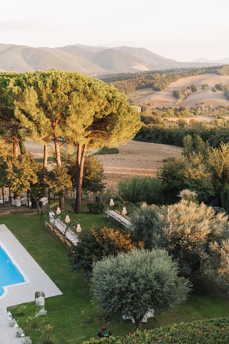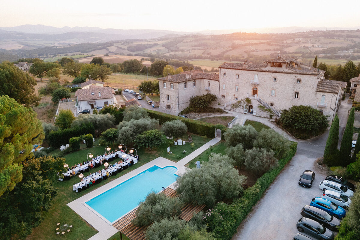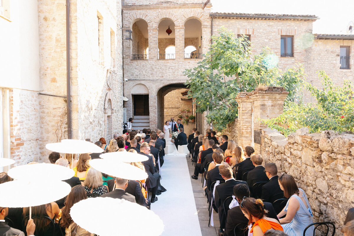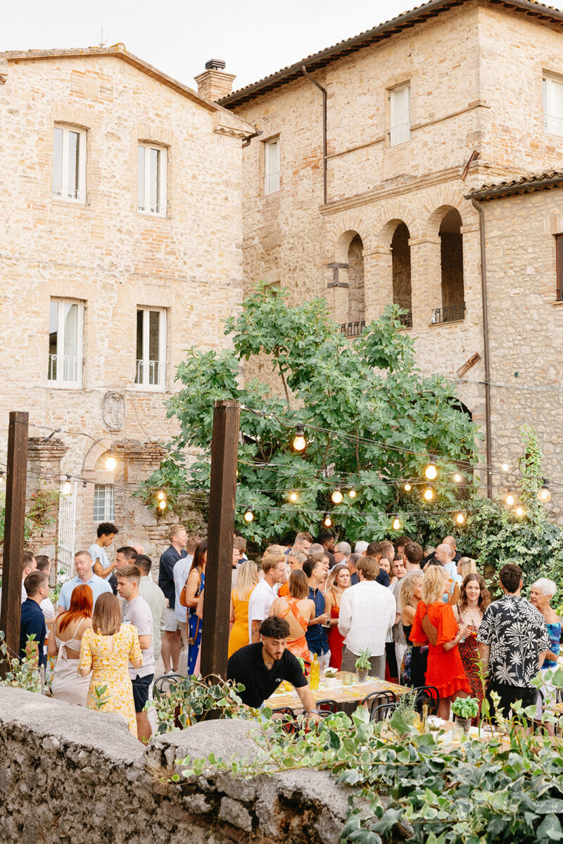 Castello di Montignano brings a sense of depth and atmosphere that’s hard to replicate, with its restored stone walls, quiet courtyards, and far-reaching Umbrian views shaping the experience. The setting feels considered rather than styled, allowing each part of the celebration to unfold naturally within the castle grounds.