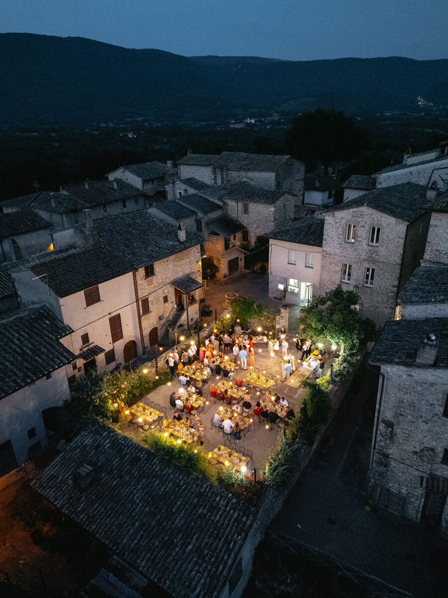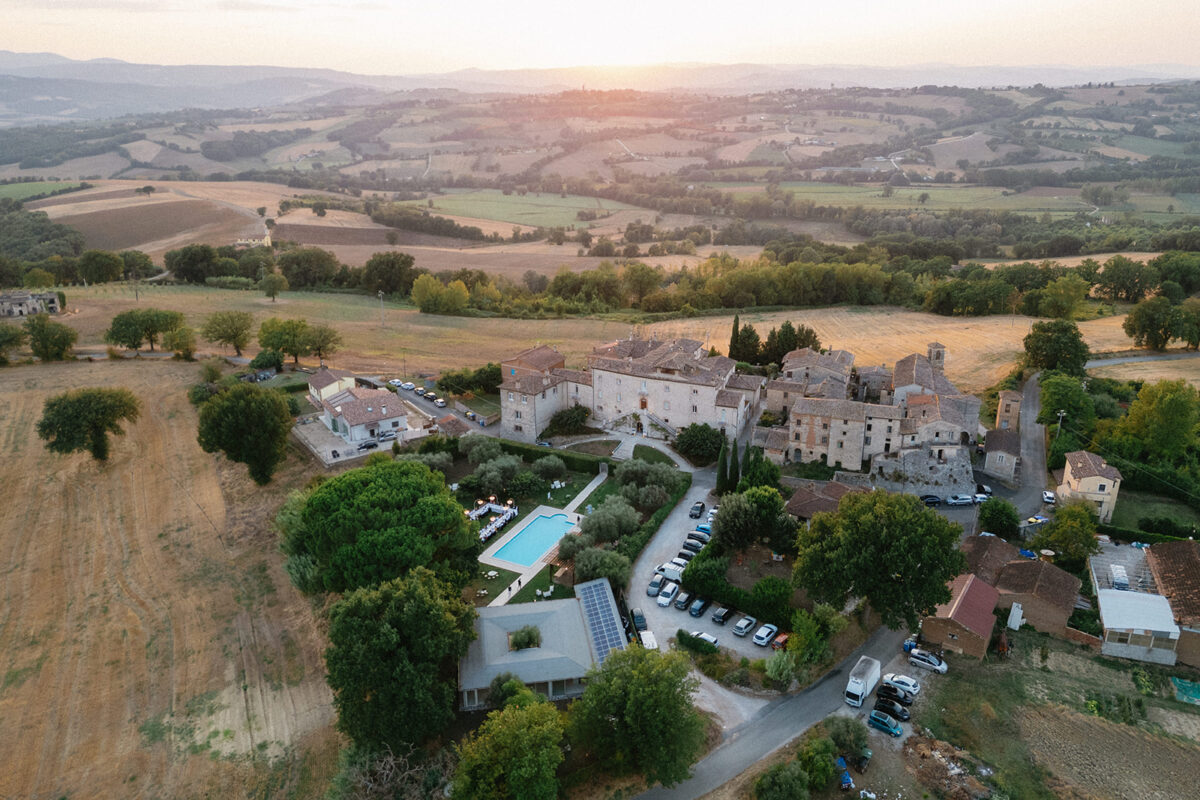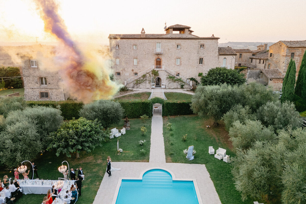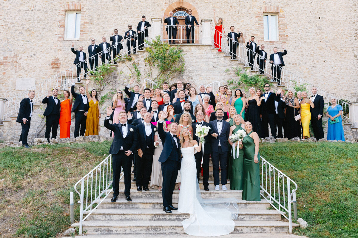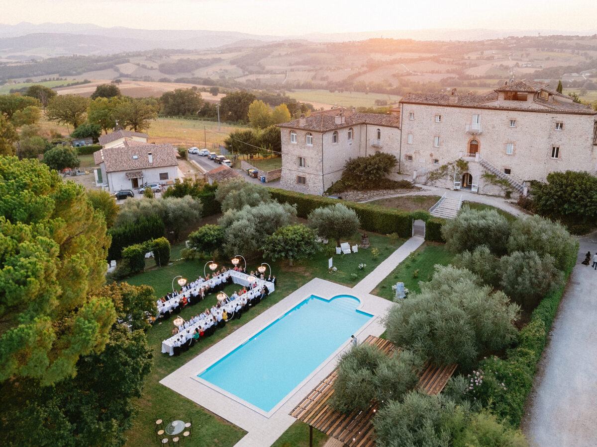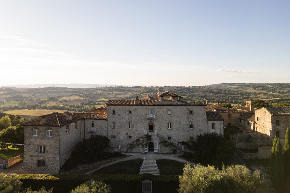 Castello di Montignano brings a sense of depth and atmosphere that’s hard to replicate, with its restored stone walls, quiet courtyards, and far-reaching Umbrian views shaping the experience. The setting feels considered rather than styled, allowing each part of the celebration to unfold naturally within the castle grounds.