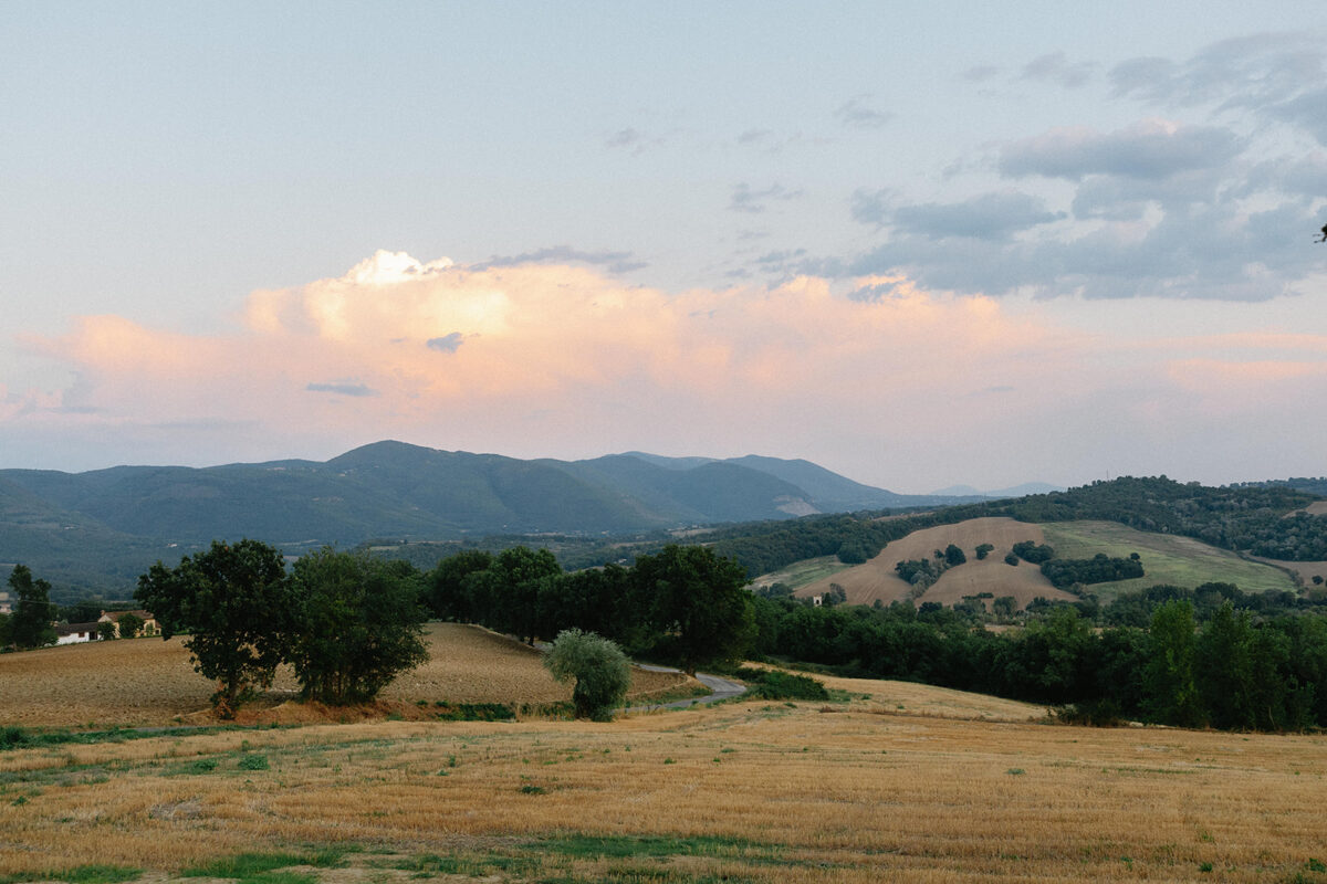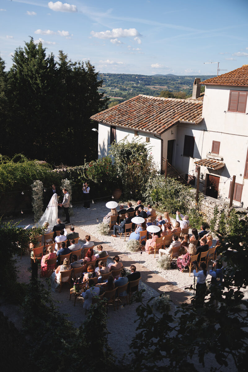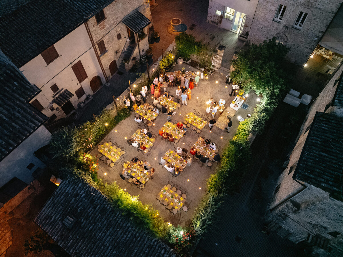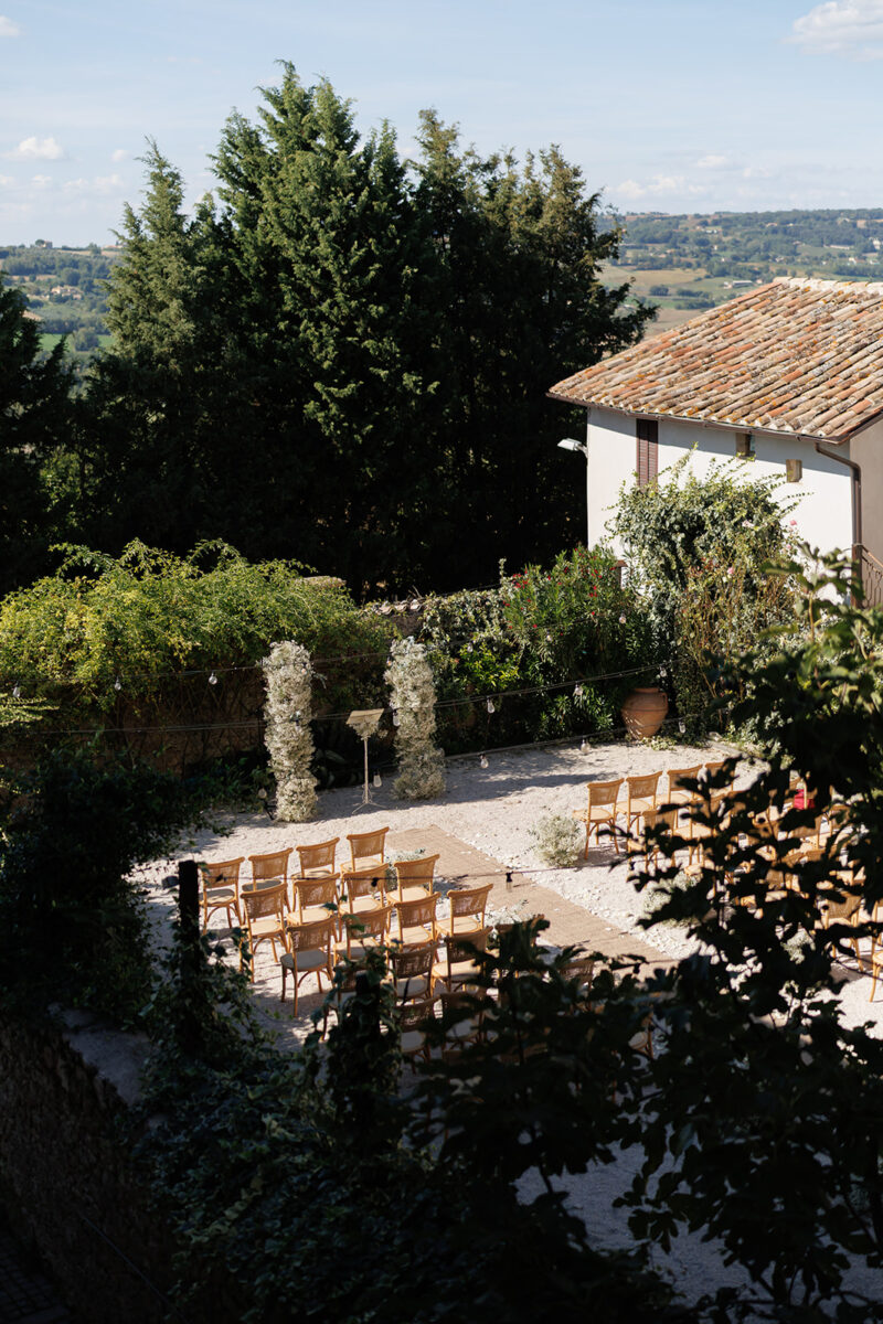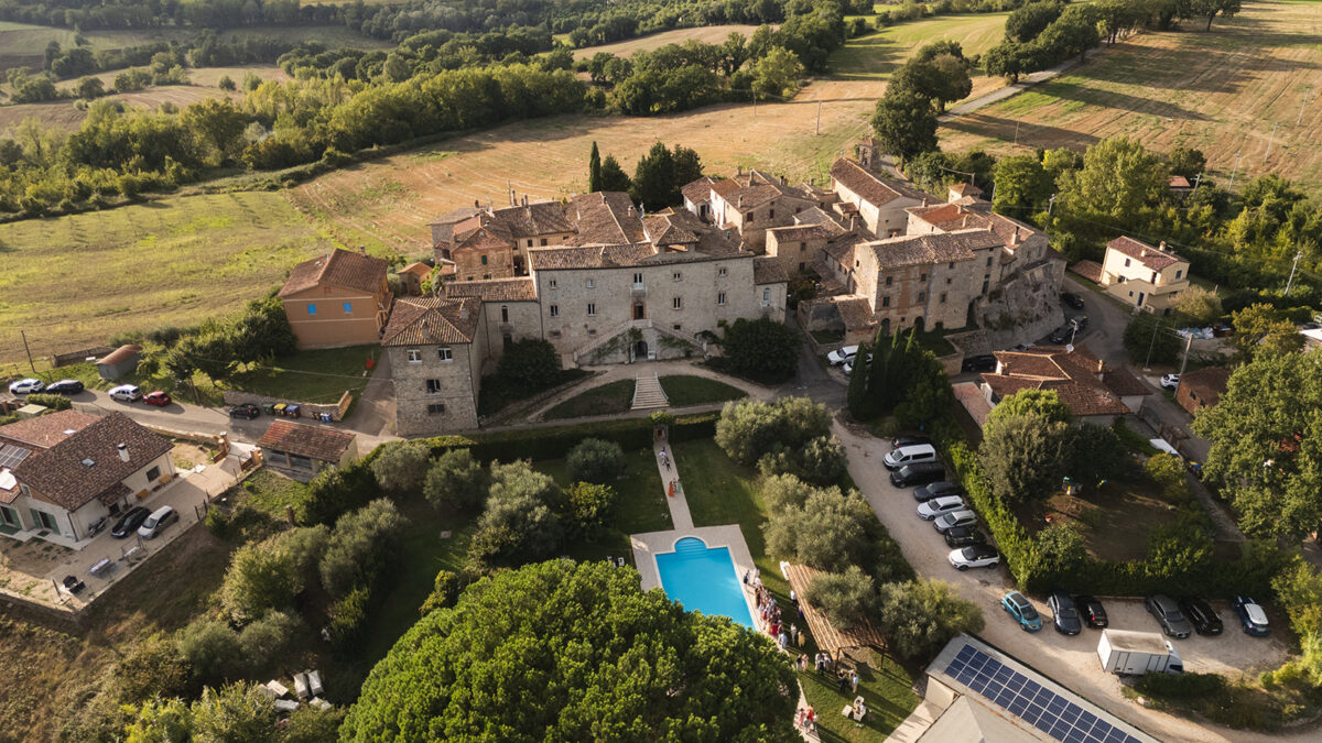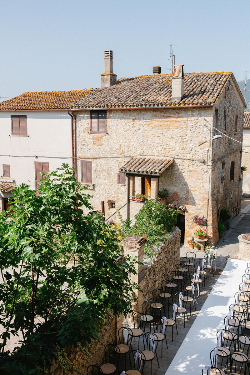 Castello di Montignano brings a sense of depth and atmosphere that’s hard to replicate, with its restored stone walls, quiet courtyards, and far-reaching Umbrian views shaping the experience. The setting feels considered rather than styled, allowing each part of the celebration to unfold naturally within the castle grounds.