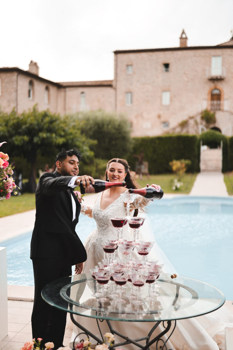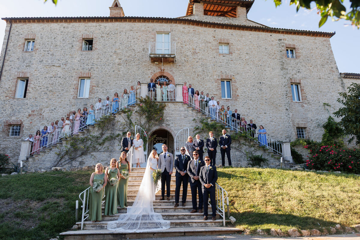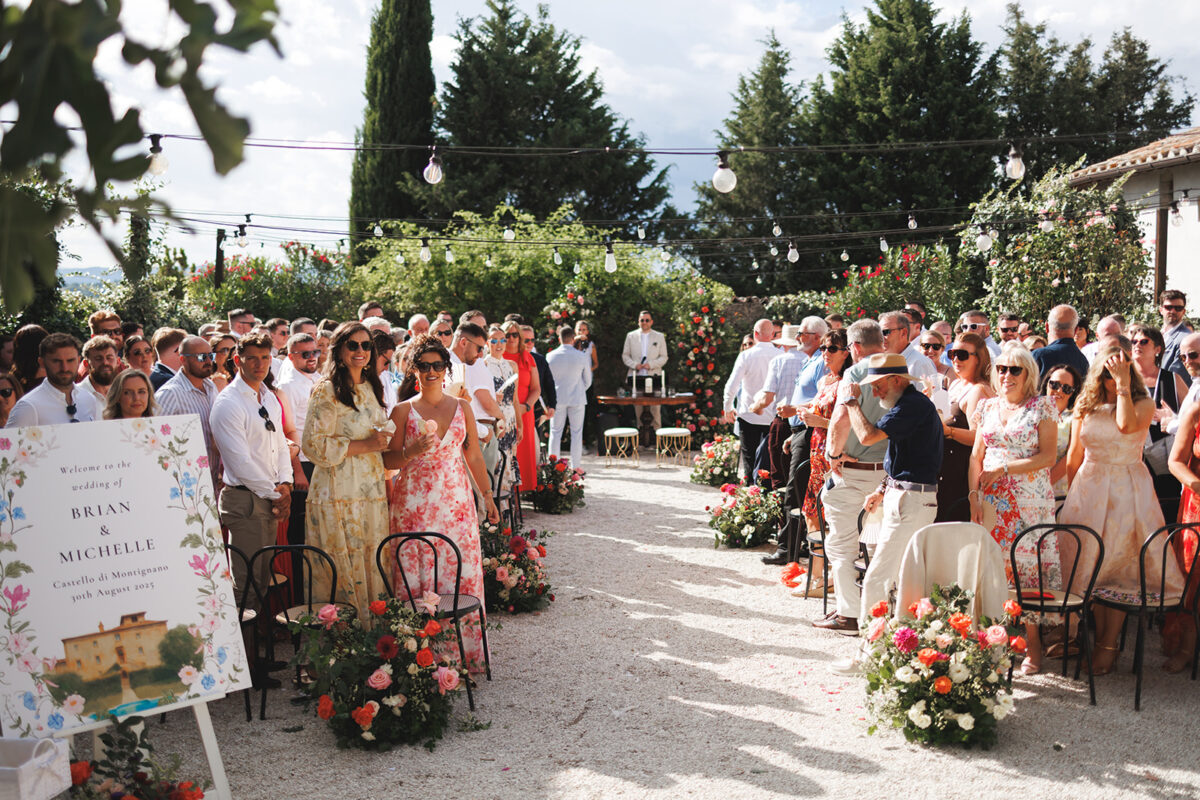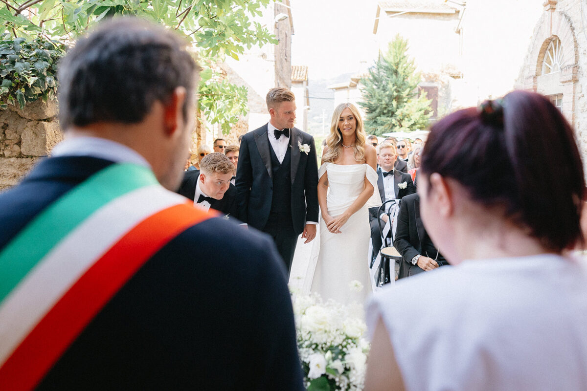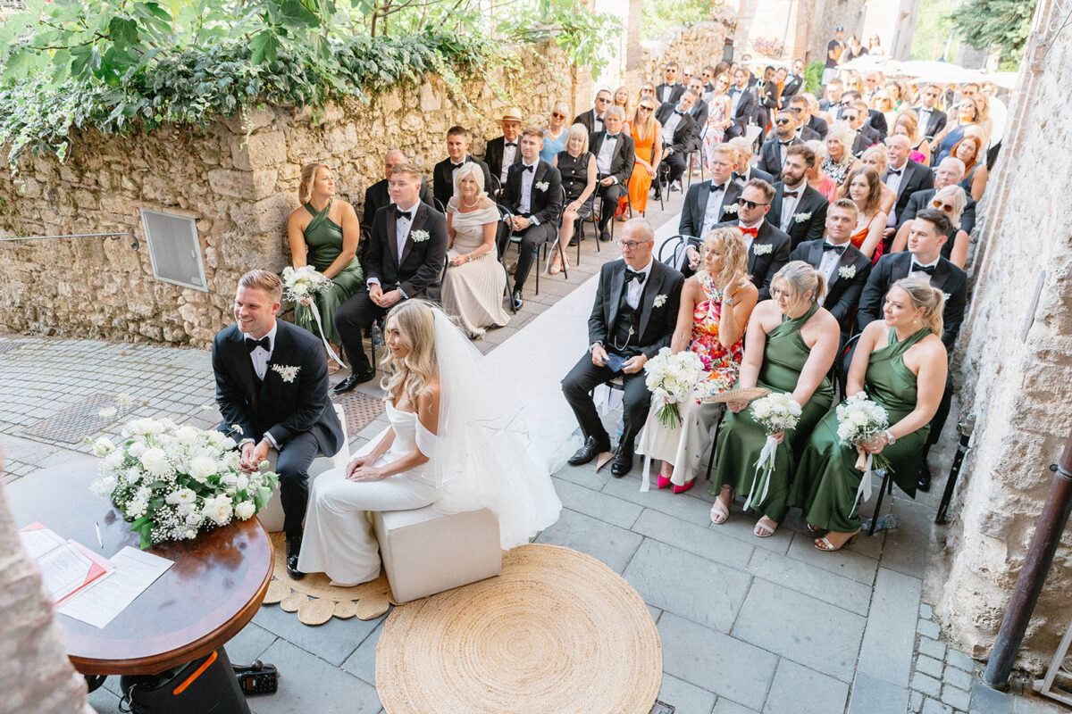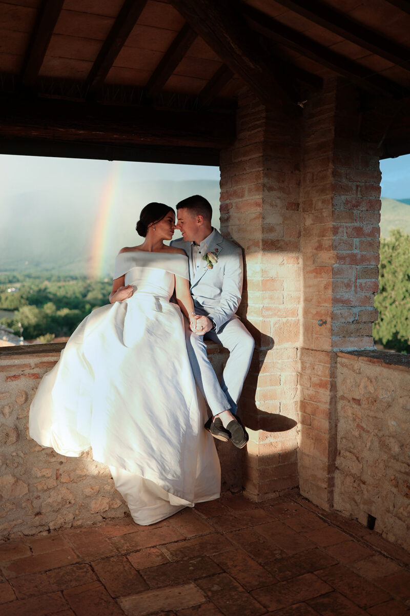 Castello di Montignano brings a sense of depth and atmosphere that’s hard to replicate, with its restored stone walls, quiet courtyards, and far-reaching Umbrian views shaping the experience. The setting feels considered rather than styled, allowing each part of the celebration to unfold naturally within the castle grounds.