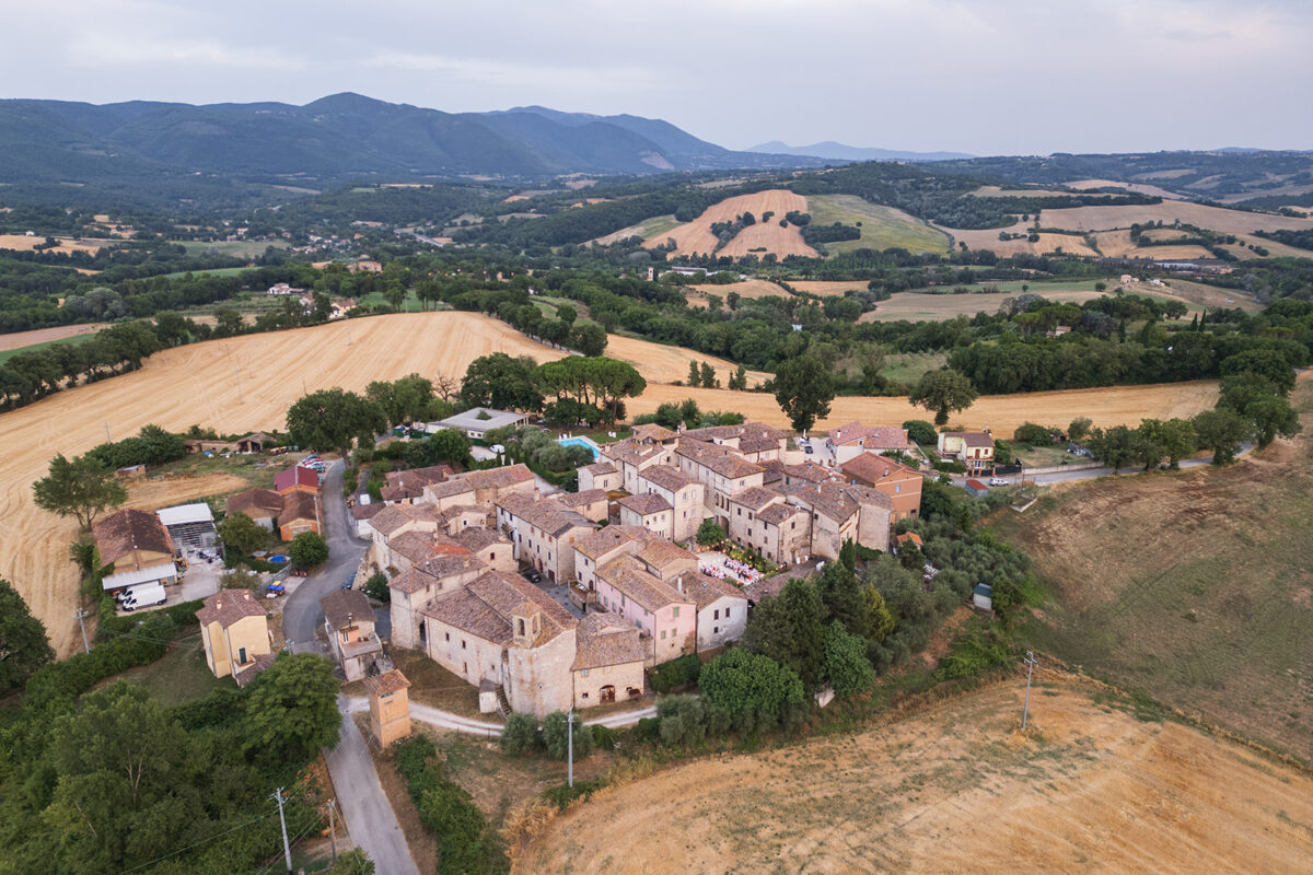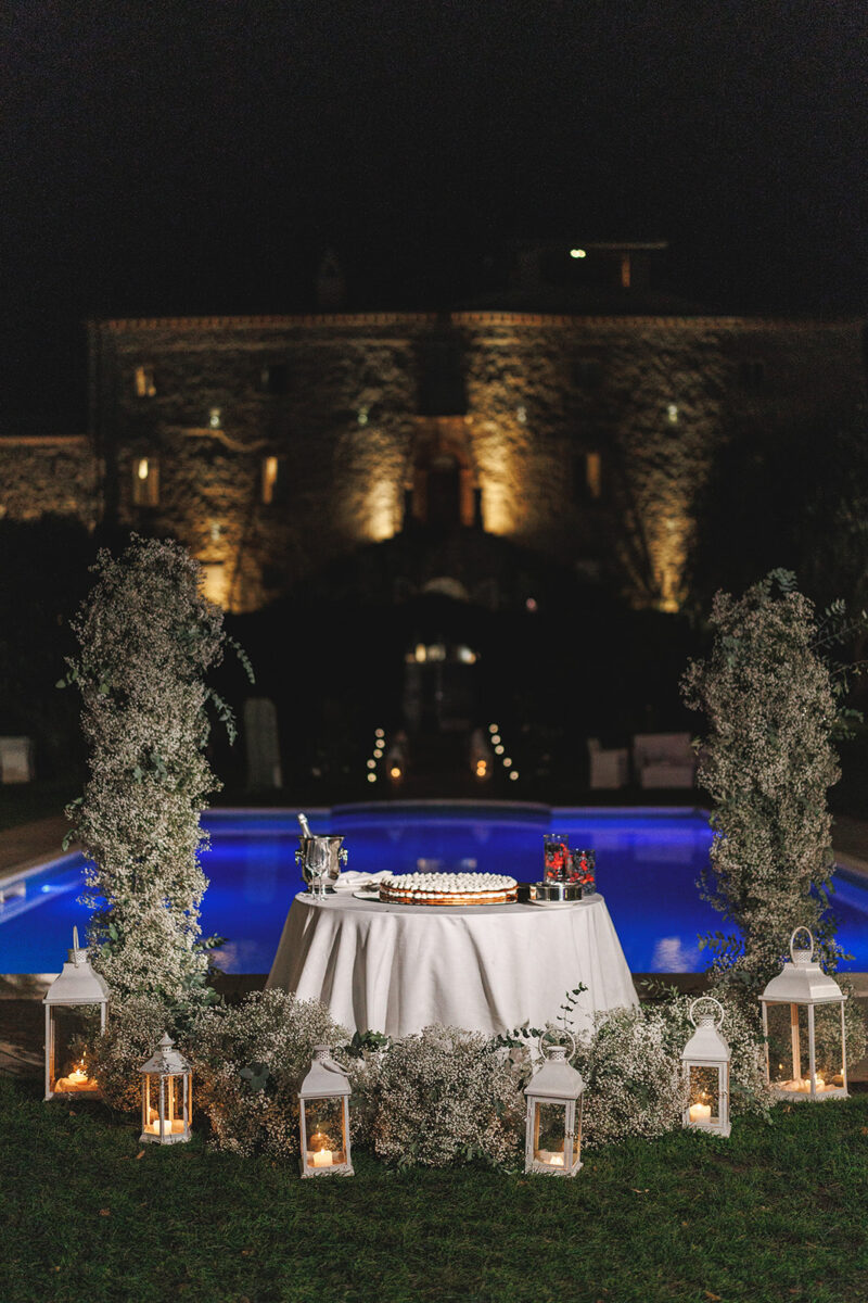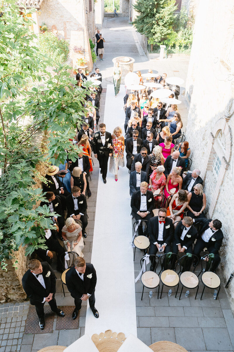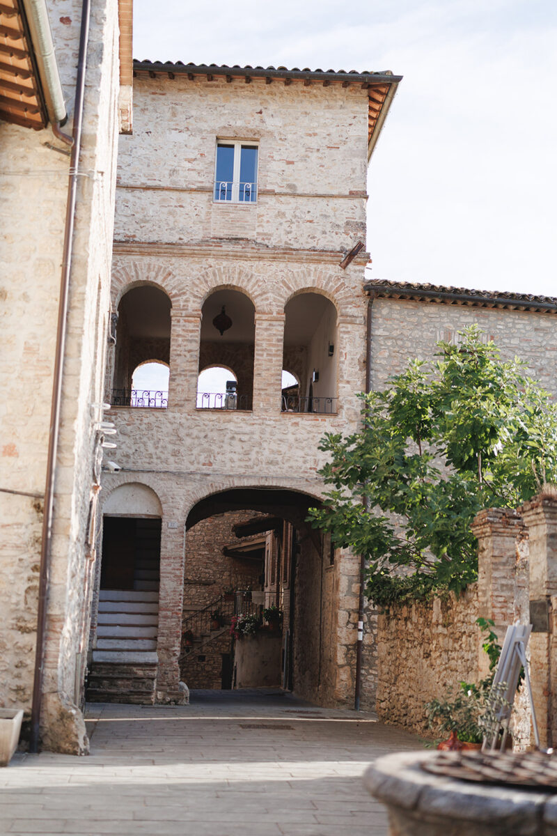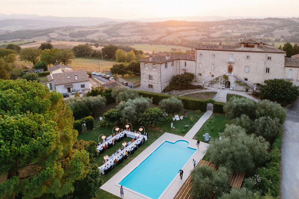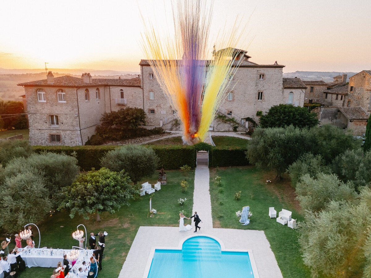 Castello di Montignano brings a sense of depth and atmosphere that’s hard to replicate, with its restored stone walls, quiet courtyards, and far-reaching Umbrian views shaping the experience. The setting feels considered rather than styled, allowing each part of the celebration to unfold naturally within the castle grounds.