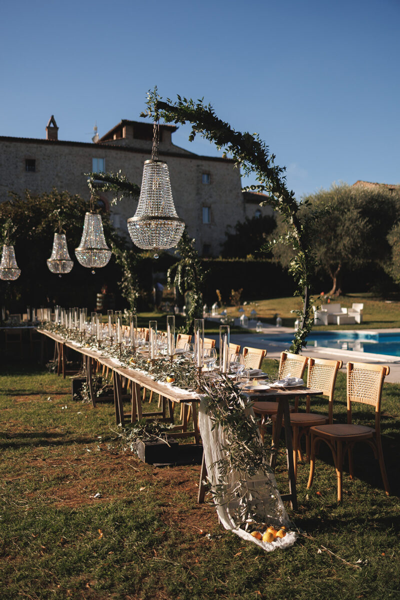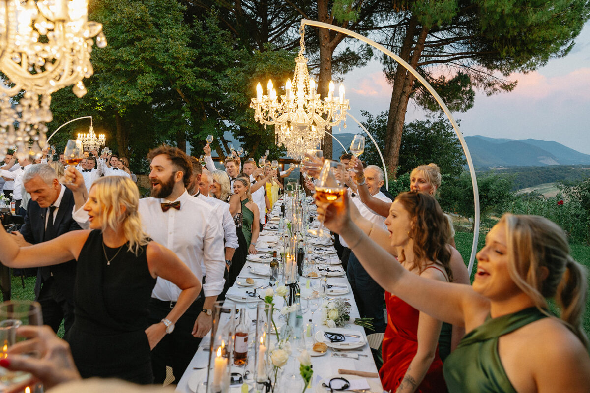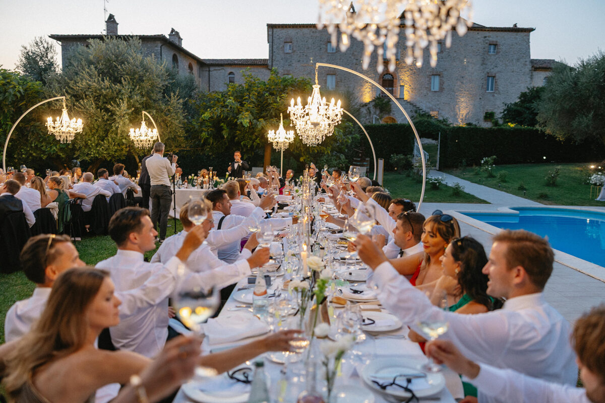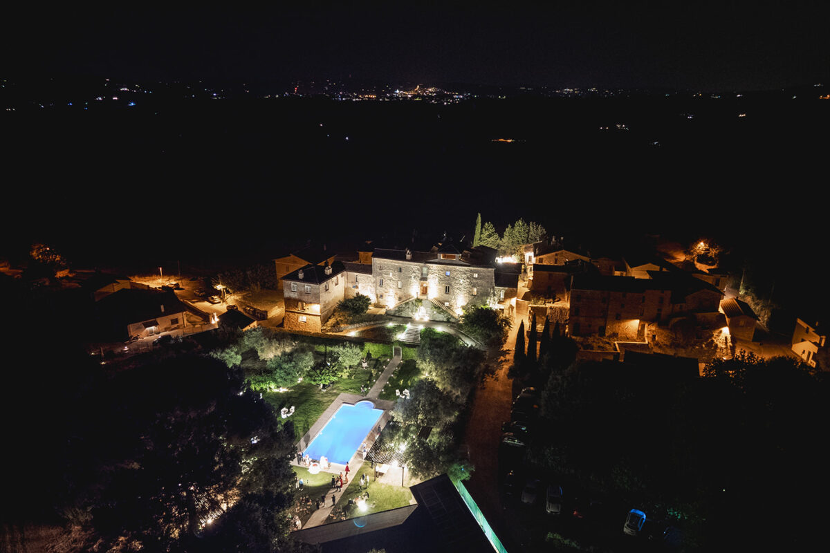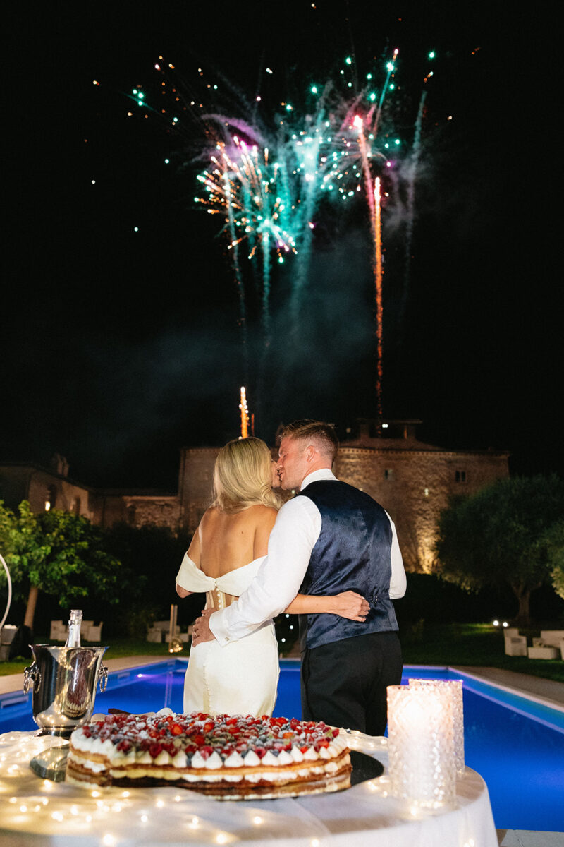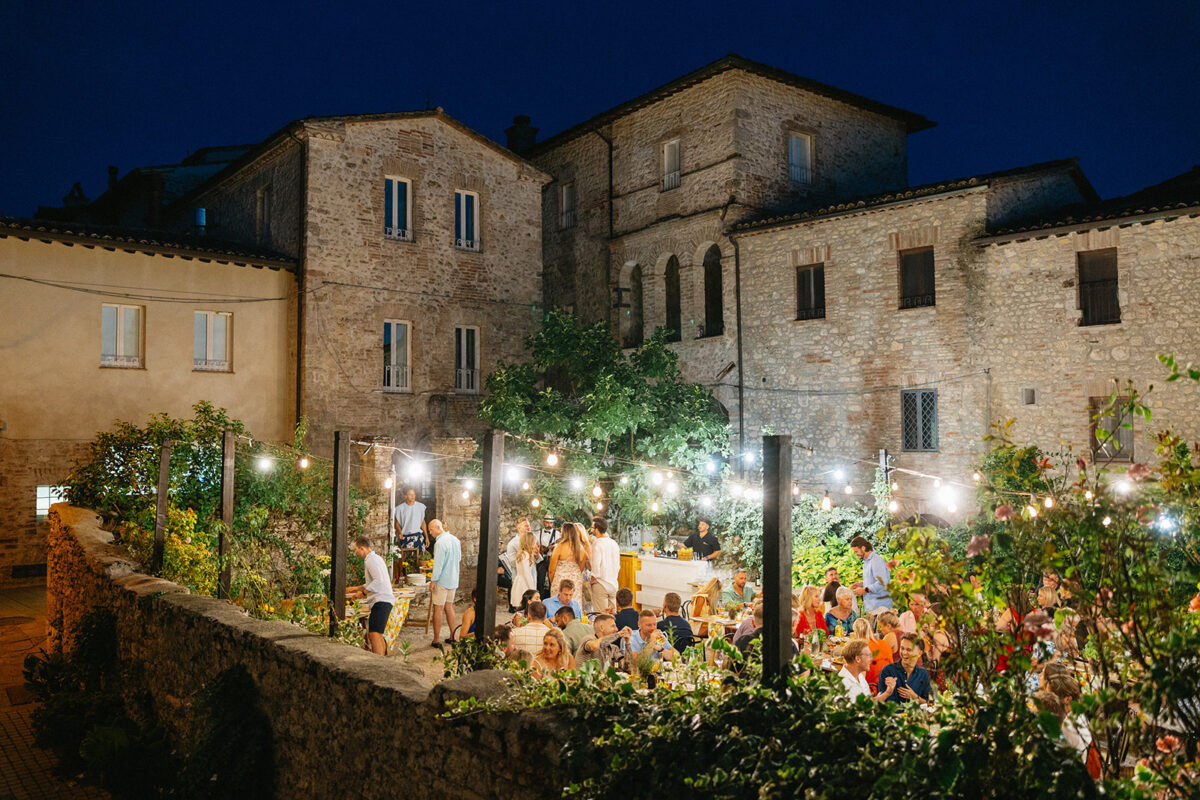 Castello di Montignano brings a sense of depth and atmosphere that’s hard to replicate, with its restored stone walls, quiet courtyards, and far-reaching Umbrian views shaping the experience. The setting feels considered rather than styled, allowing each part of the celebration to unfold naturally within the castle grounds.
