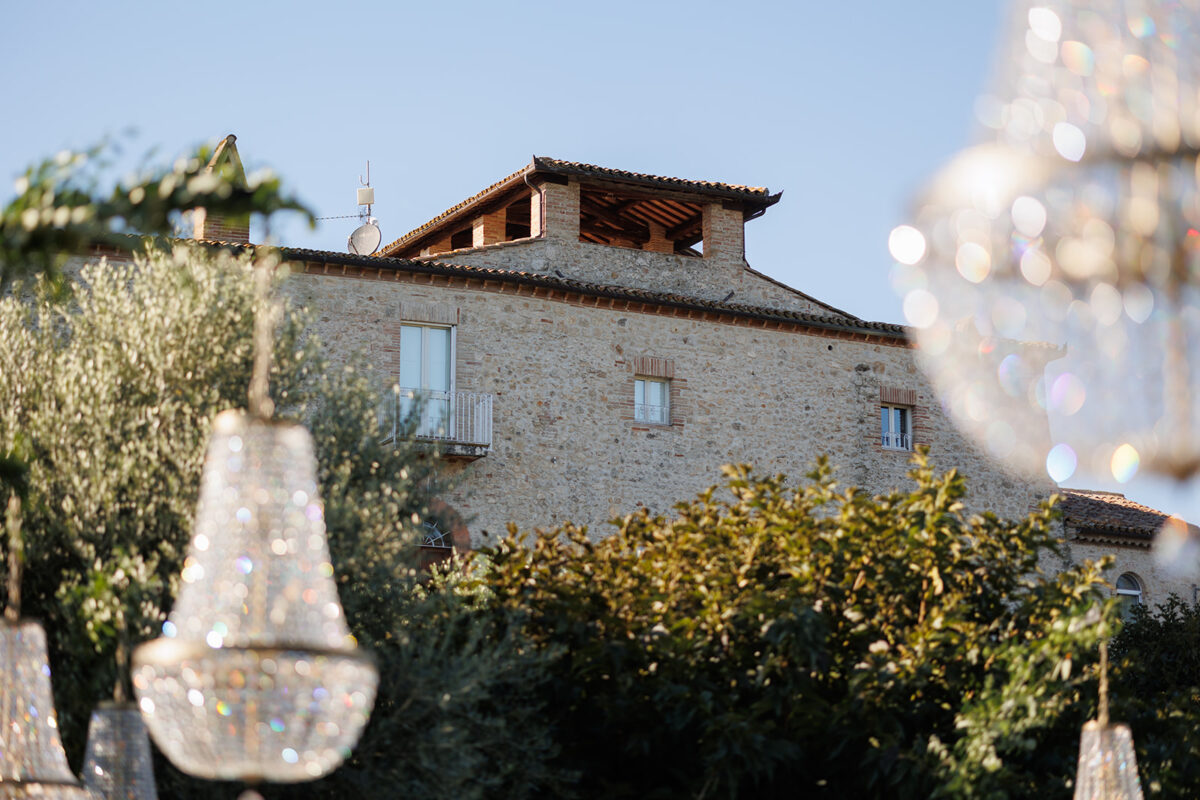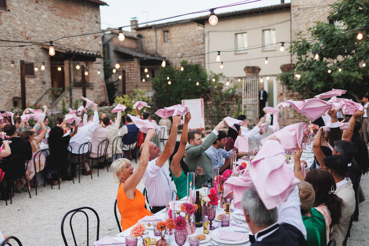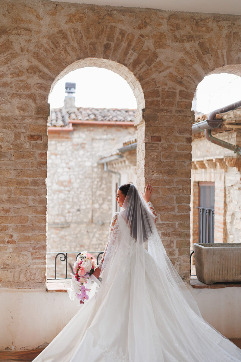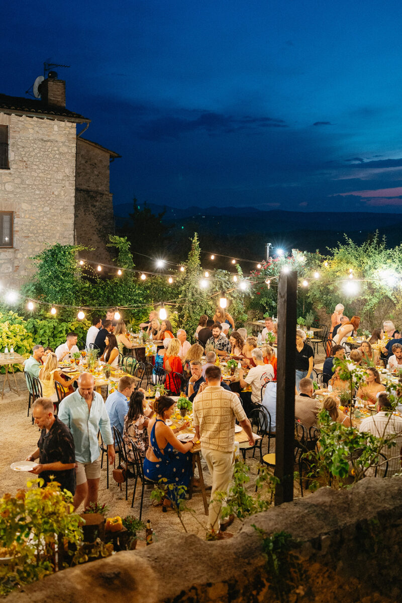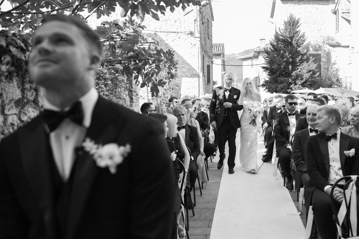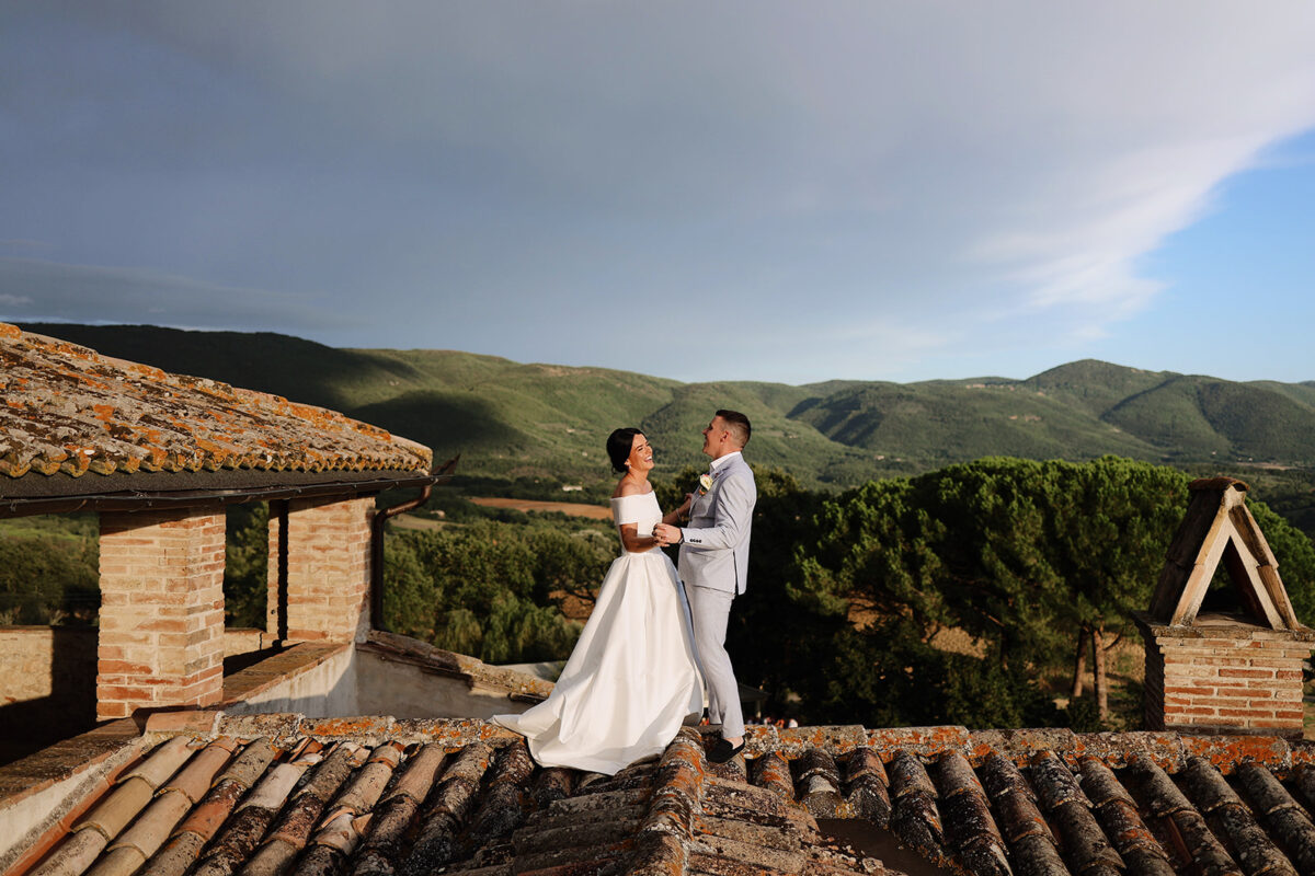 Castello di Montignano brings a sense of depth and atmosphere that’s hard to replicate, with its restored stone walls, quiet courtyards, and far-reaching Umbrian views shaping the experience. The setting feels considered rather than styled, allowing each part of the celebration to unfold naturally within the castle grounds.