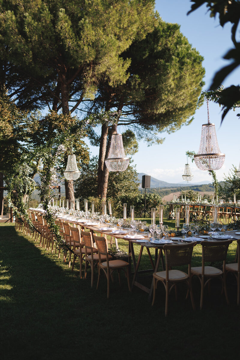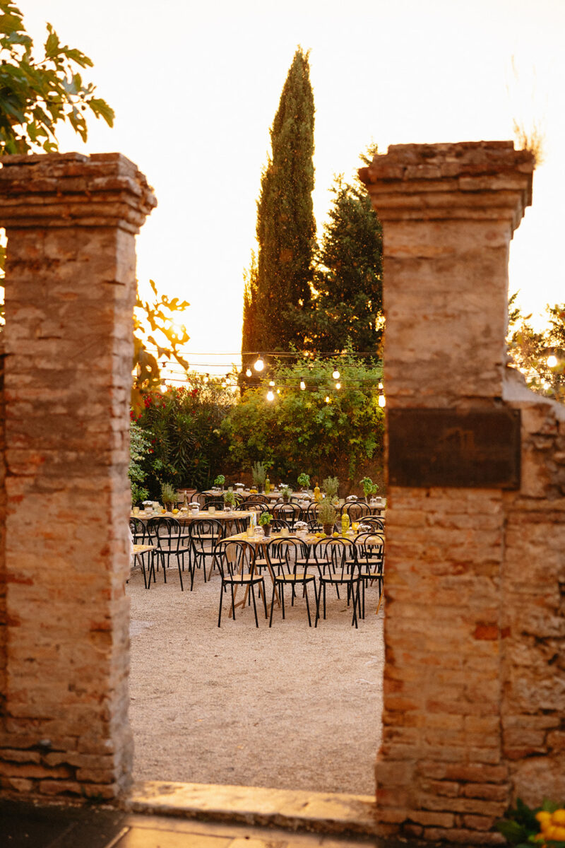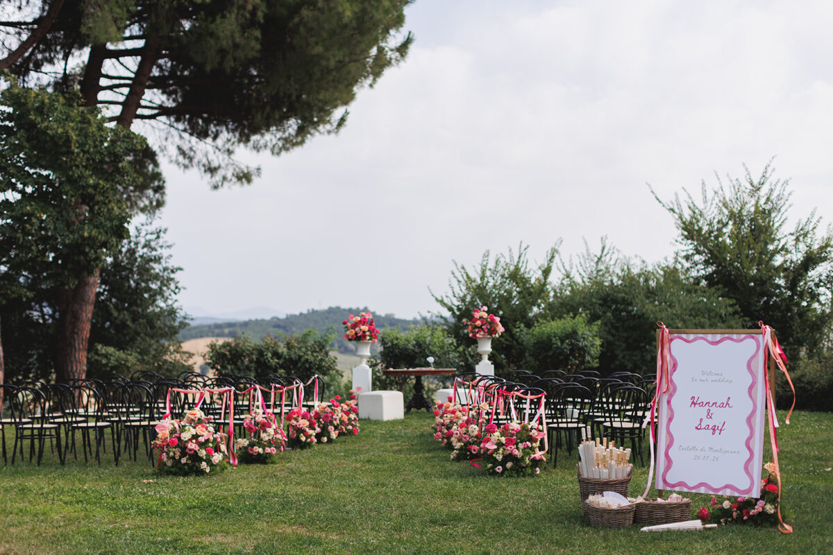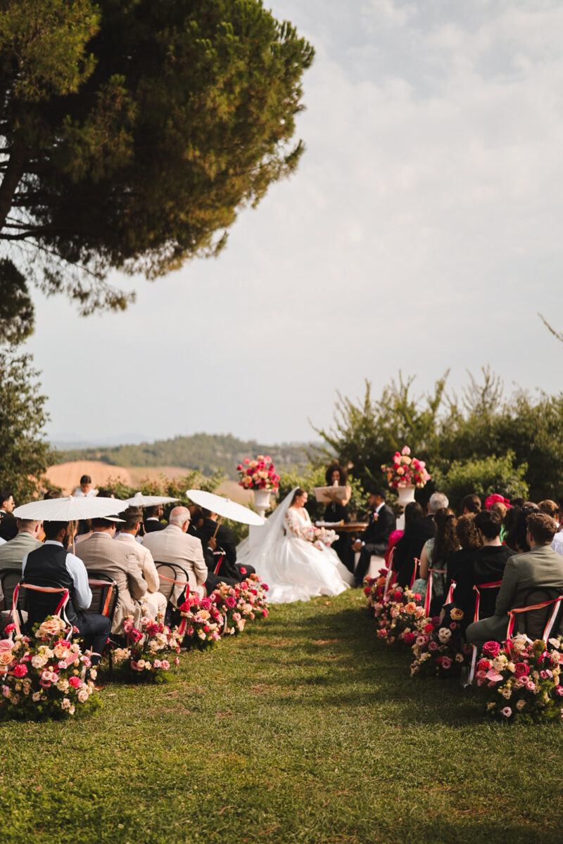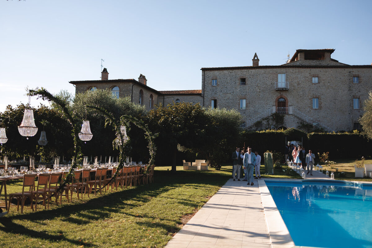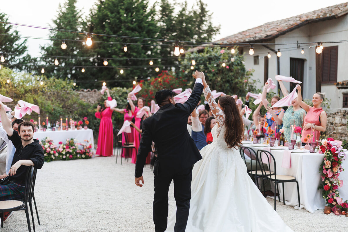 Weddings at Castello di Montignano unfold with the quiet sense of ease that you’d expect from the sweeping Italian countryside. Ceremonies can take place in the gardens or within the stone interiors, each setting carrying its own atmosphere, before guests move into an aperitif that lingers into the evening. From there, the celebration settles into a beautifully paced reception, with each part of the day flowing naturally, thanks to the expert support of the in-house team, creating an experience that lets you savor and appreciate every moment.